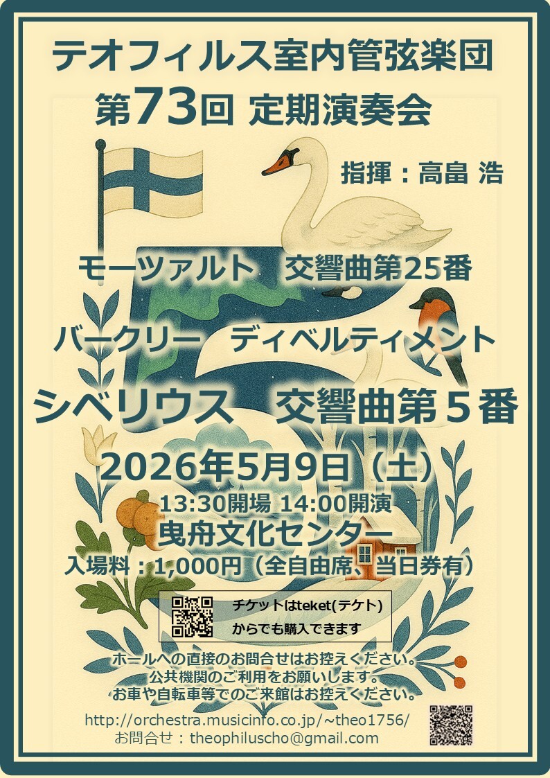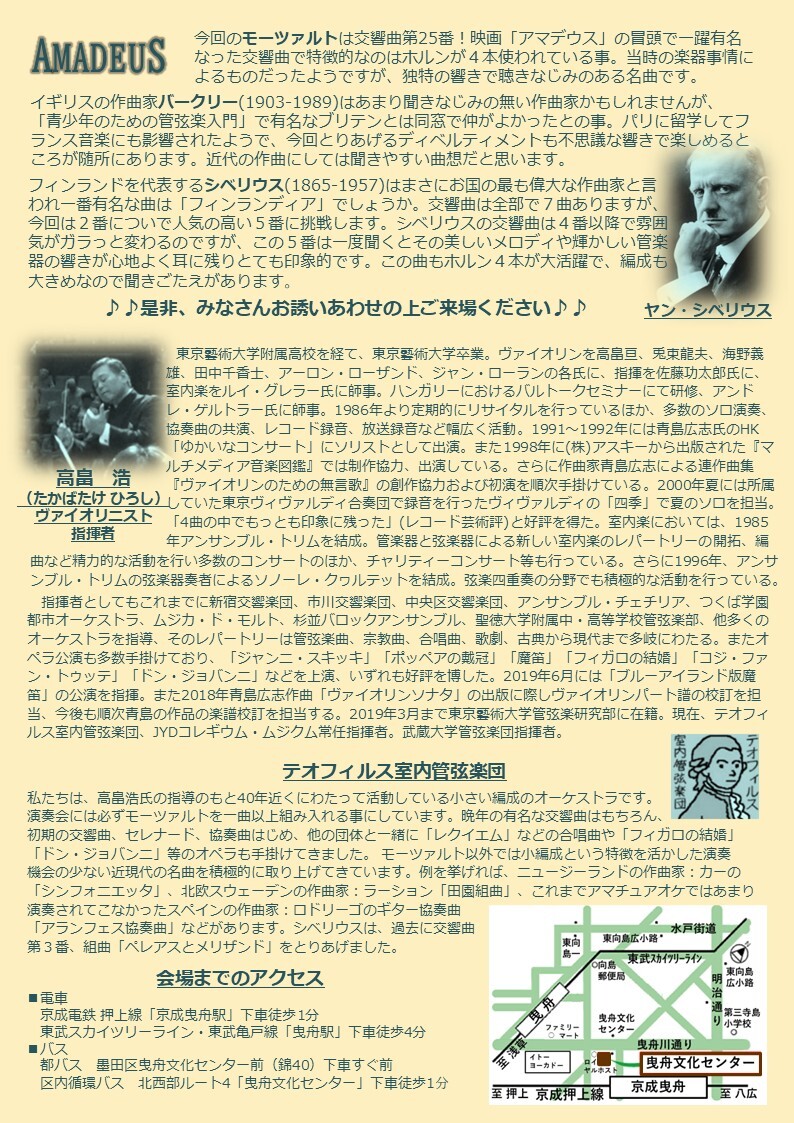 毎回モーツアルト必ず1曲取り上げるオケです。今回は交響曲第25番。初挑戦になるシベリウス交響曲第5番をお届けします。