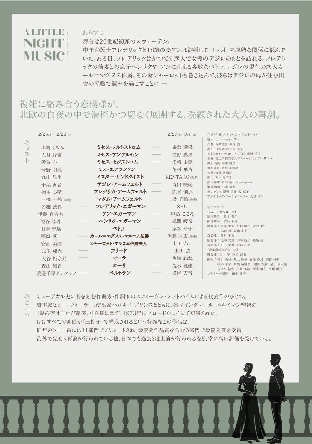 ミュージカル史に名を刻む作曲家・作詞家のスティーヴン・ソンドハイムによる代表作のひとつ。脚本家ヒュー・ウィーラー、演出家ハロルド・プリンスとともに、名匠イングマール・ベルイマン監督の『夏の夜は三たび微笑む』を基に製作、1973年にブロードウェイにて初演された。ほぼすべての楽曲が「三拍子」で構成されるという特異なこの作品は、同年のトニー賞には11部門でノミネートされ、最優秀作品賞を含む6部門で最優秀賞を受賞。海外では度々再演が行われている他、日本でも過去3度上演が行われるなど、常に高い評価を受けている。