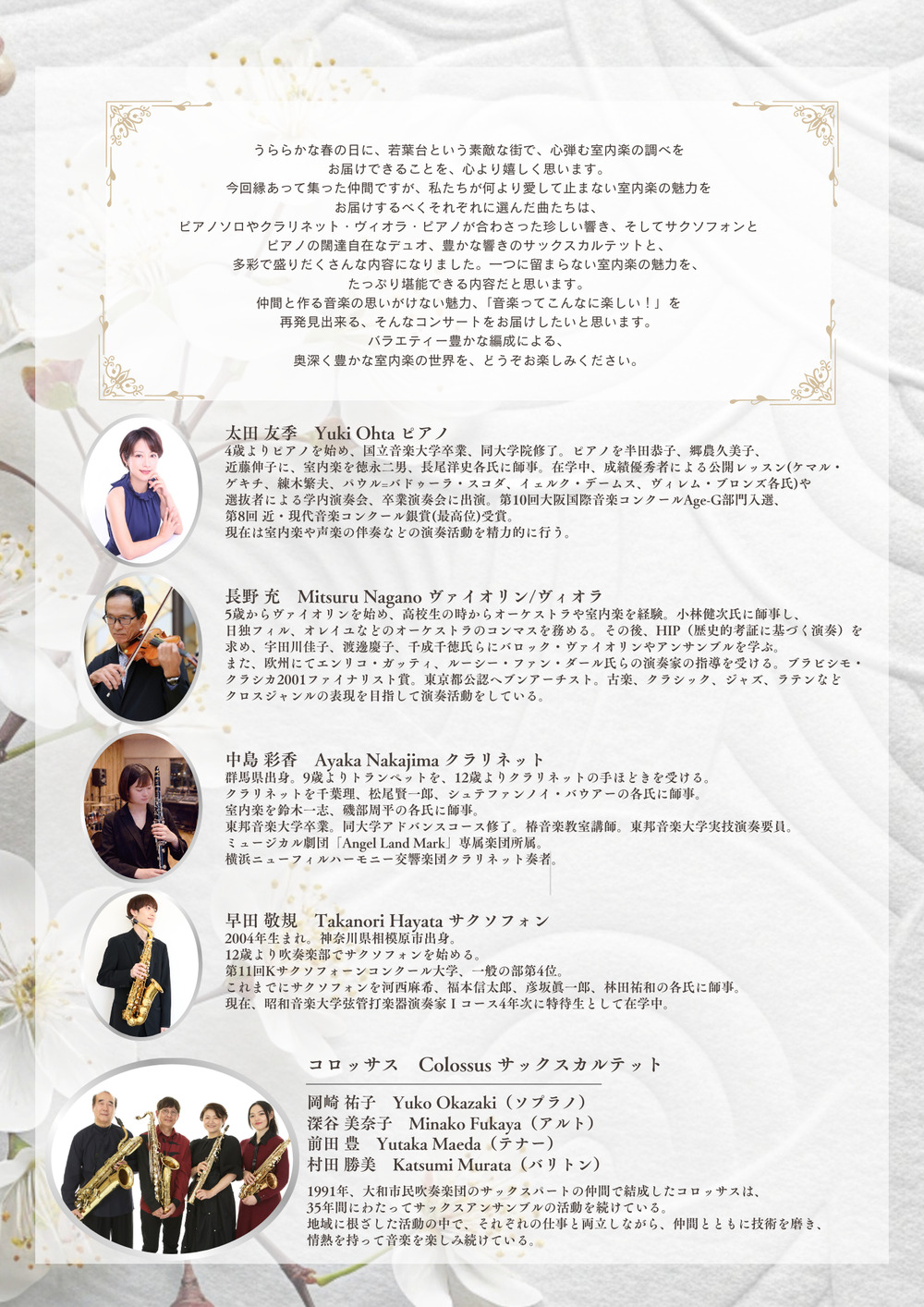 春の木漏れ日溢れる季節に、本格的なクラシックから親しみやすいミュージカル作品まで、心温まる室内楽の調べをお届けします。