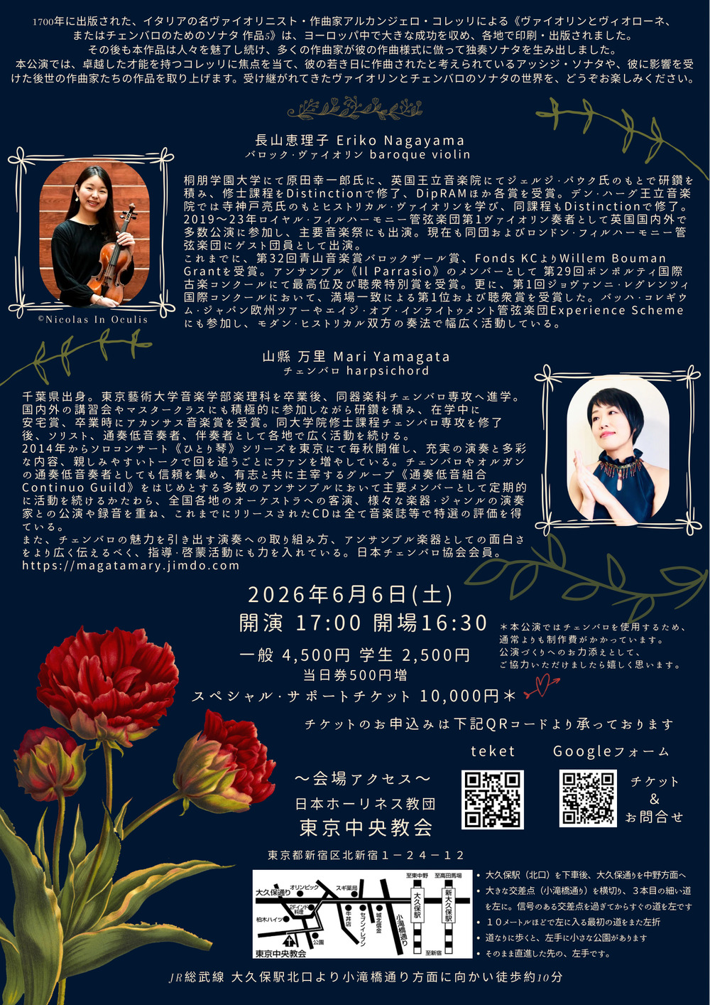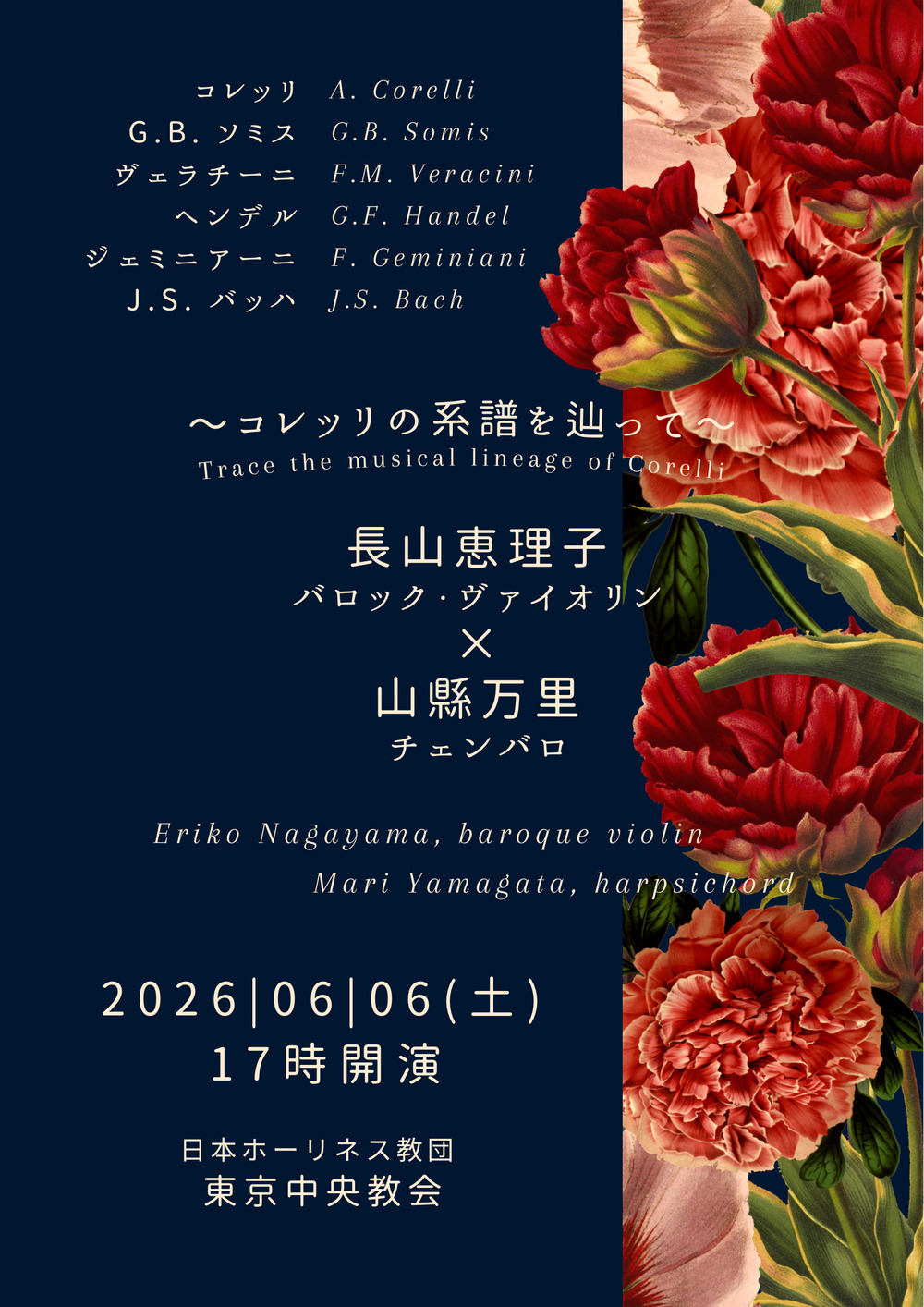 本公演では、卓越した才能を持つコレッリに焦点を当て、彼の若き日に作曲されたと考えられているアッシジ・ソナタや、彼に影響を受けた後世の作曲家たちの作品を取り上げます。受け継がれてきたヴァイオリンとチェンバロのソナタの世界を、どうぞお楽しみください。