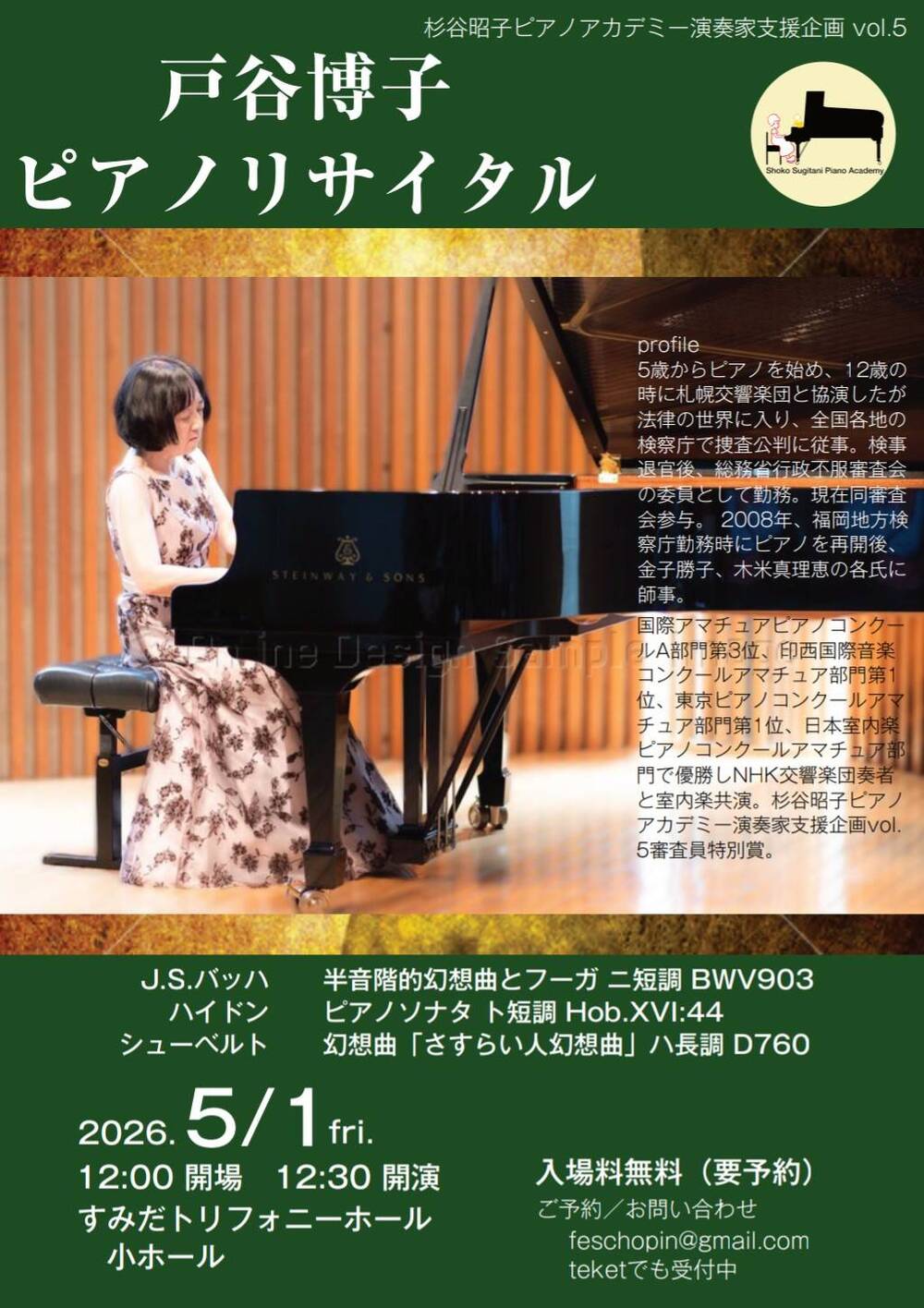 杉谷昭子ピアノアカデミー演奏家支援企画Vol.5のオーディションで審査員特別賞を受賞し、リサイタルを開催する運びとなりました。気軽に来場していただければ幸いです。