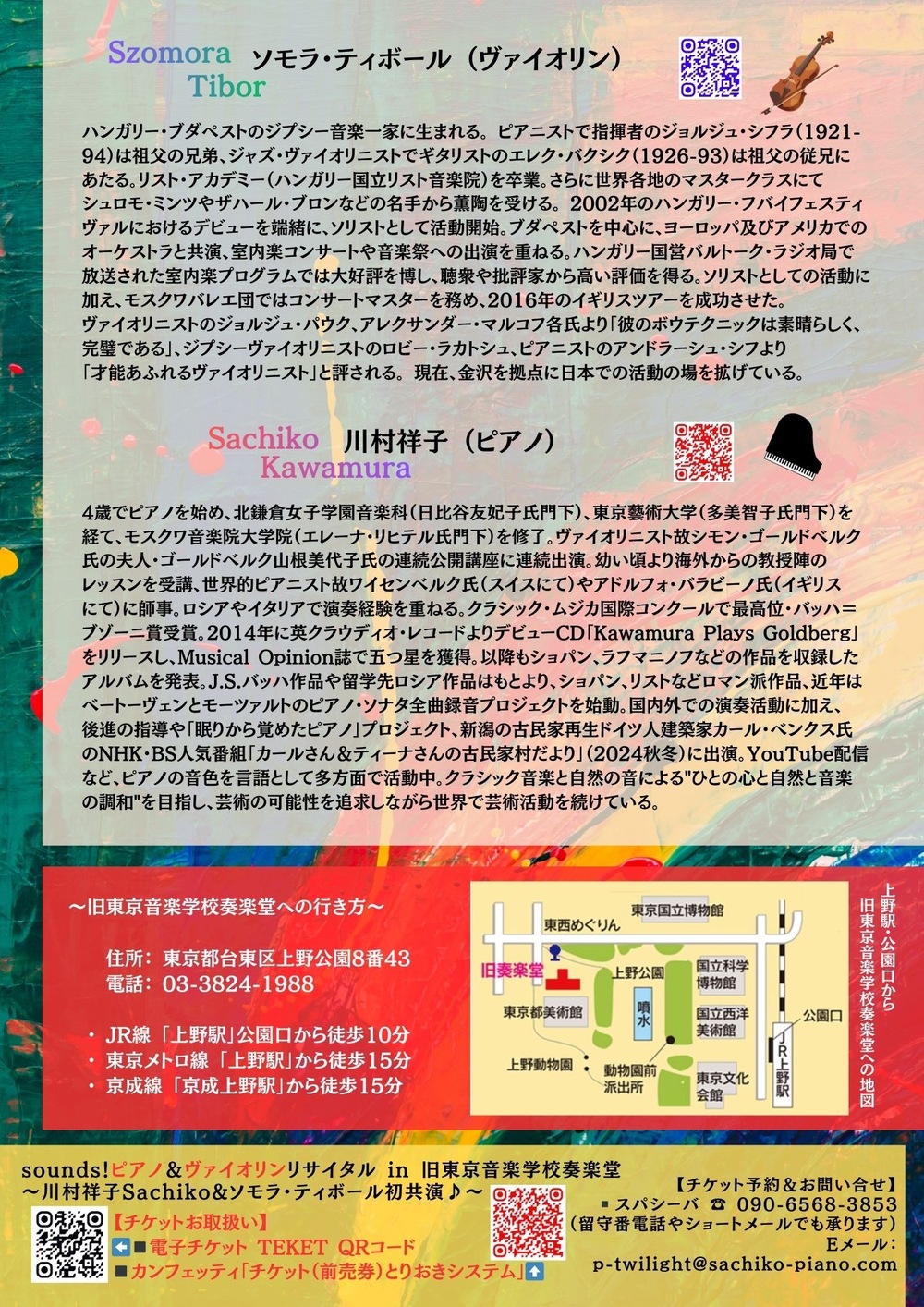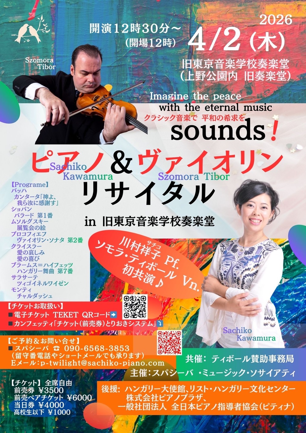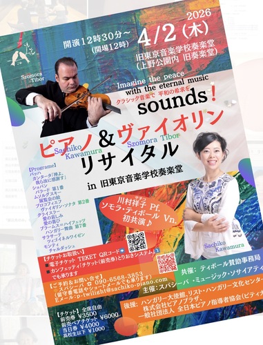 ハンガリーの至宝ヴァイオリニスト、ソモラ・ティボール氏とピアニスト川村祥子との記念すべき初共演!ショパン「バラード第1番」、ムソルグスキー「展覧会の絵」、プロコフィエフ「ヴァイオリン・ソナタ第2番」、サラサーテ「ツィゴイネルワイゼン」、モンティ「チャルダッシュ」などなどクラシックの名曲が次々に響き渡ります。どうぞ上野公園内にございます重要文化財、日本最古の洋式音楽ホール旧東京音楽学校の素敵な建築物の響きと共に上質な音楽のひとときをお楽しみください。
