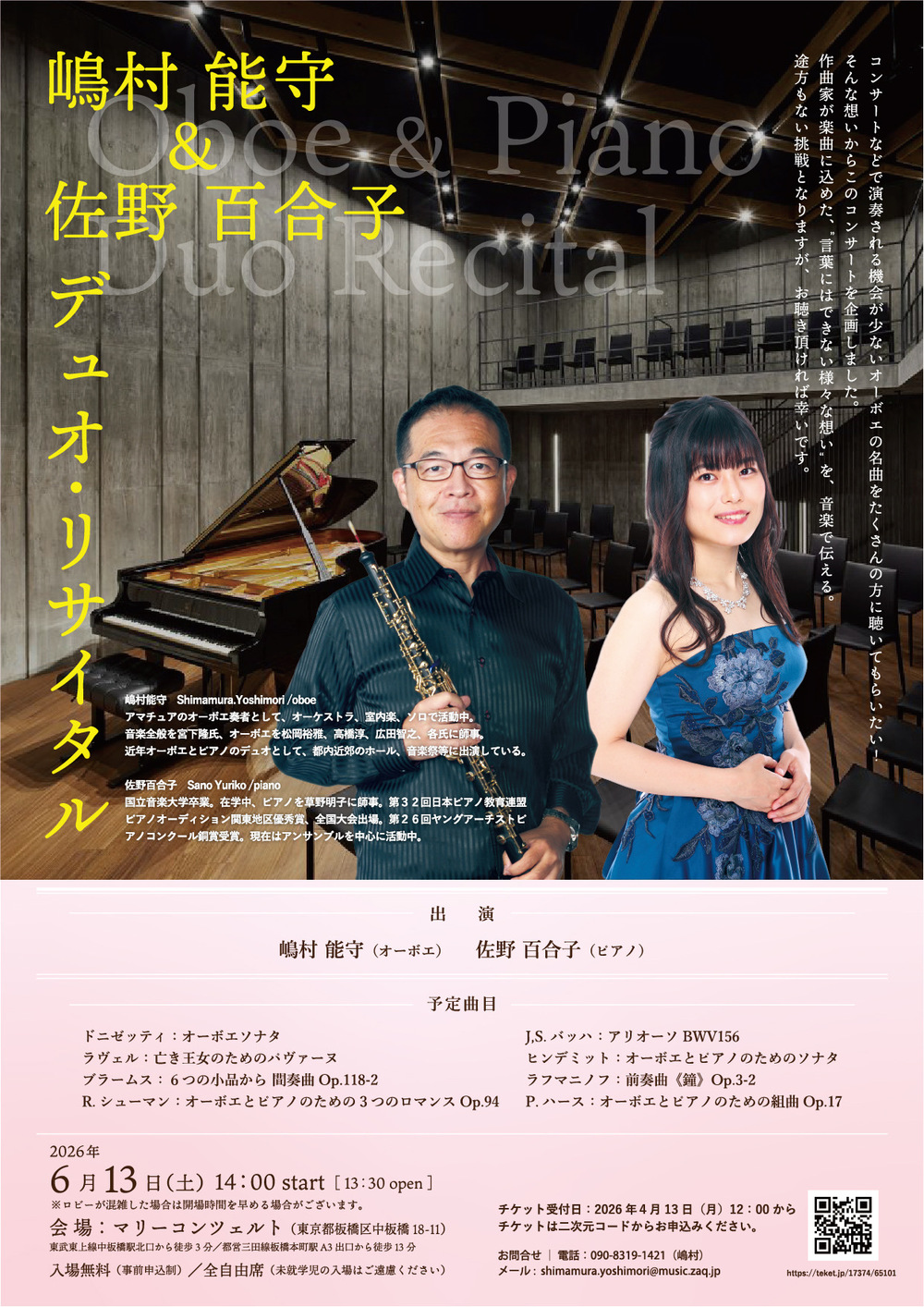 オーボエと、ピアノのデュオとして、都内近郊のホールや音楽祭などで演奏活動を行っています。