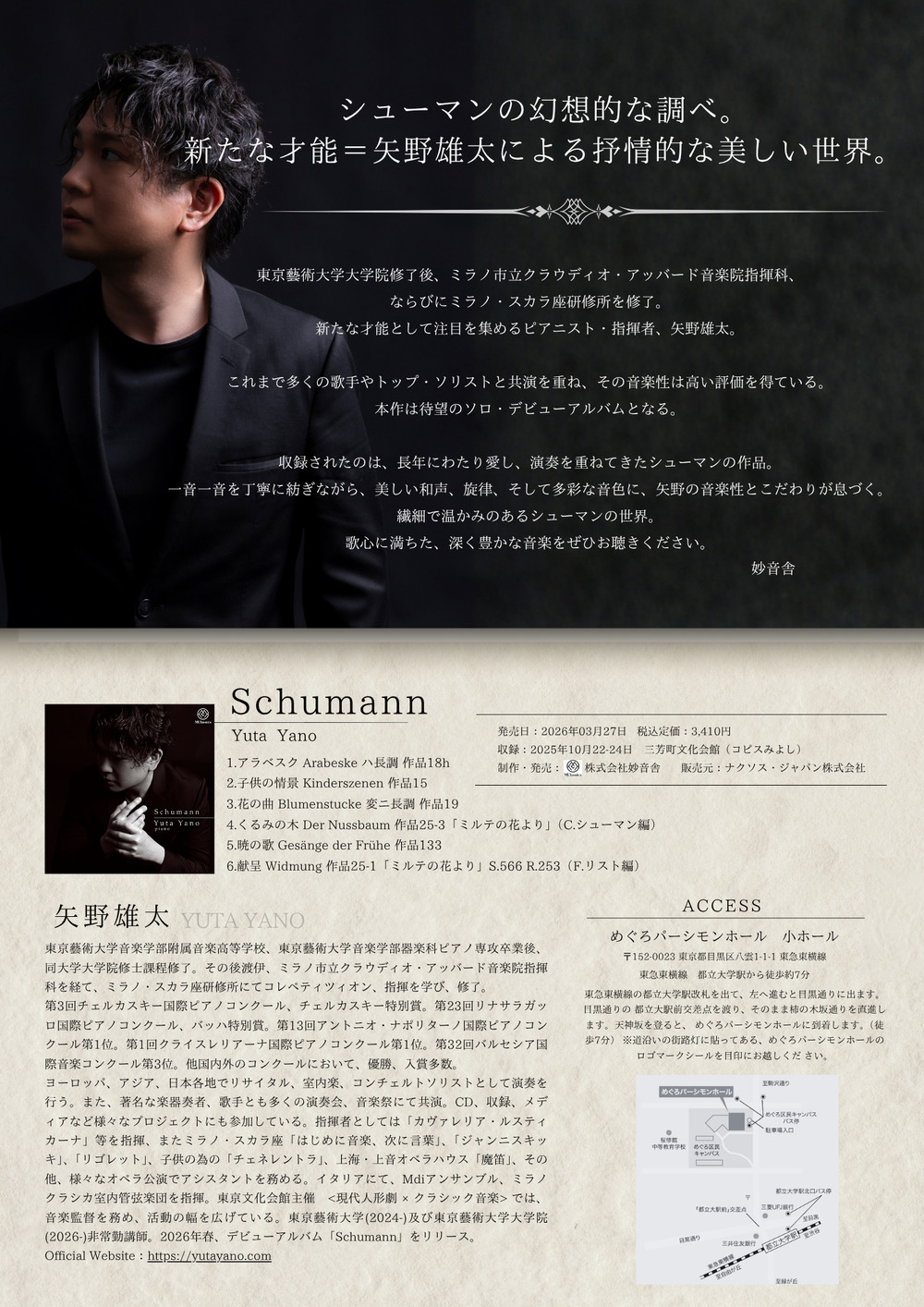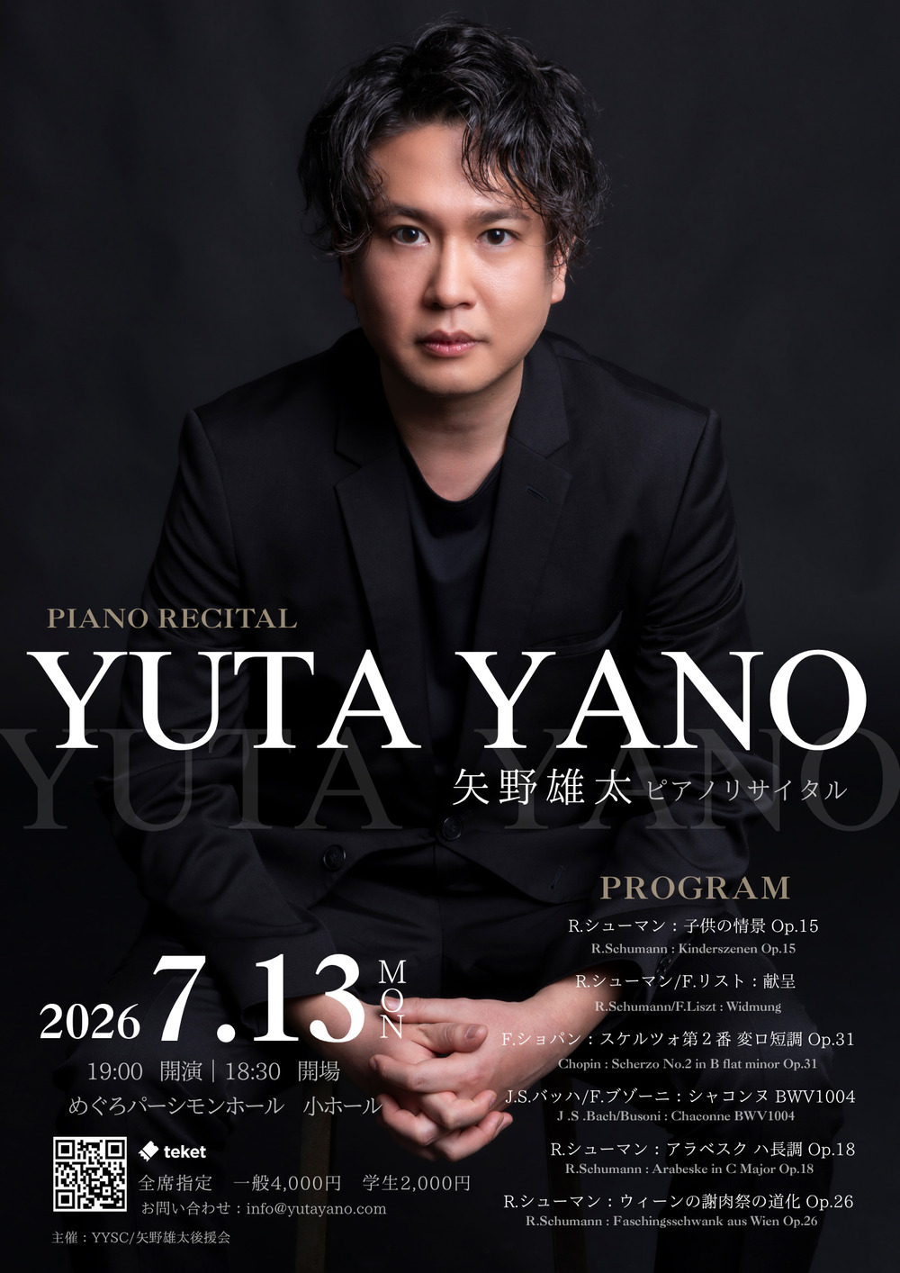 デビューアルバム収録曲であるシューマンを軸に矢野雄太が大切にしているプログラムで挑むピアノリサイタル。