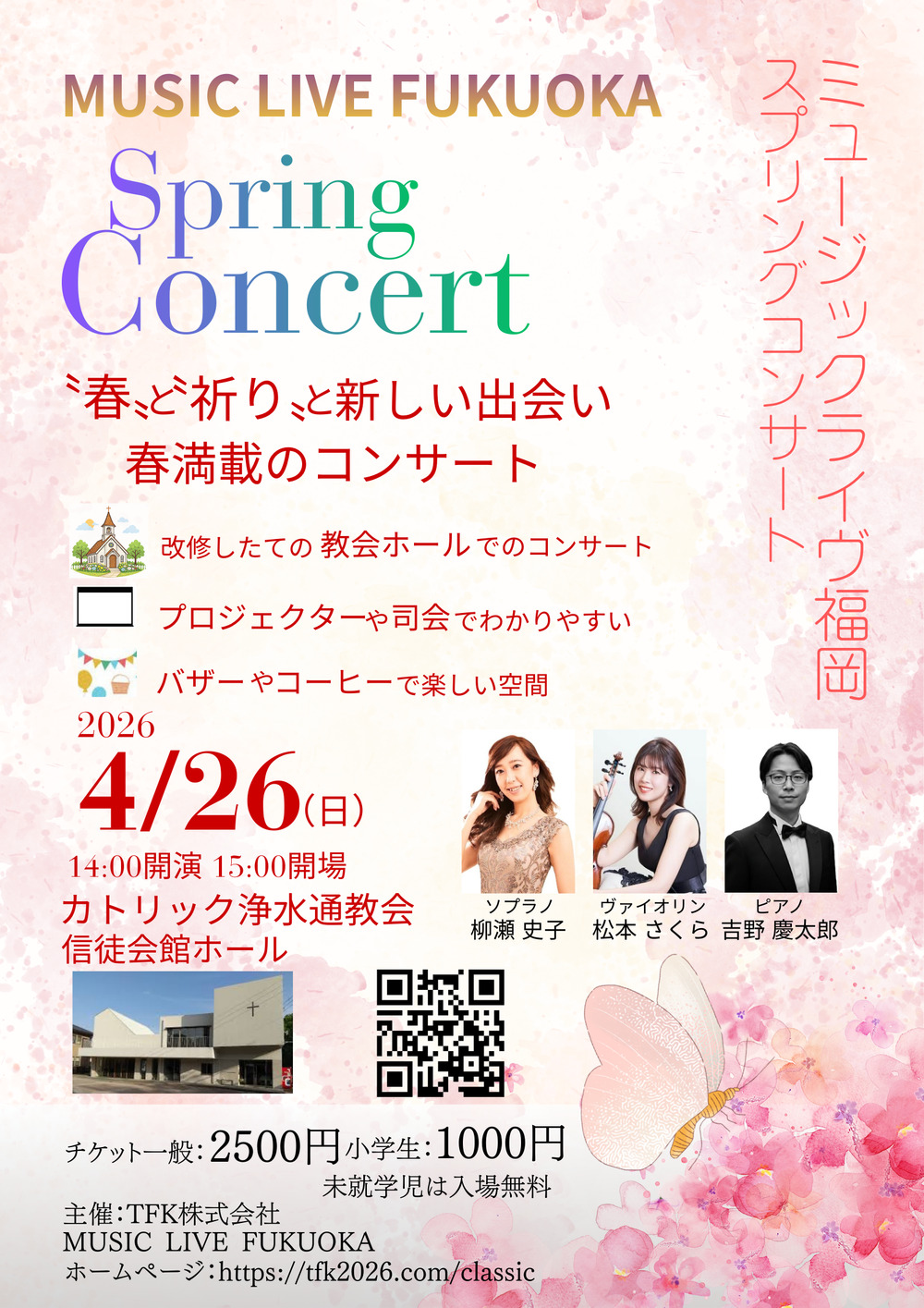 年間60本イベントを掲げるMUSIC LIVE FUKUOKAの柿落とし的イベント!最初のアーティストは福岡のクラシック界で有名なアーティストに演奏していただきます。改修したばかりの教会のホールで、バザーやコーヒーなどを楽しみながら、いつもと違う日常を味わってください!クラシックが分からなくても、映像や司会が面白くクラシックの世界へ誘います!