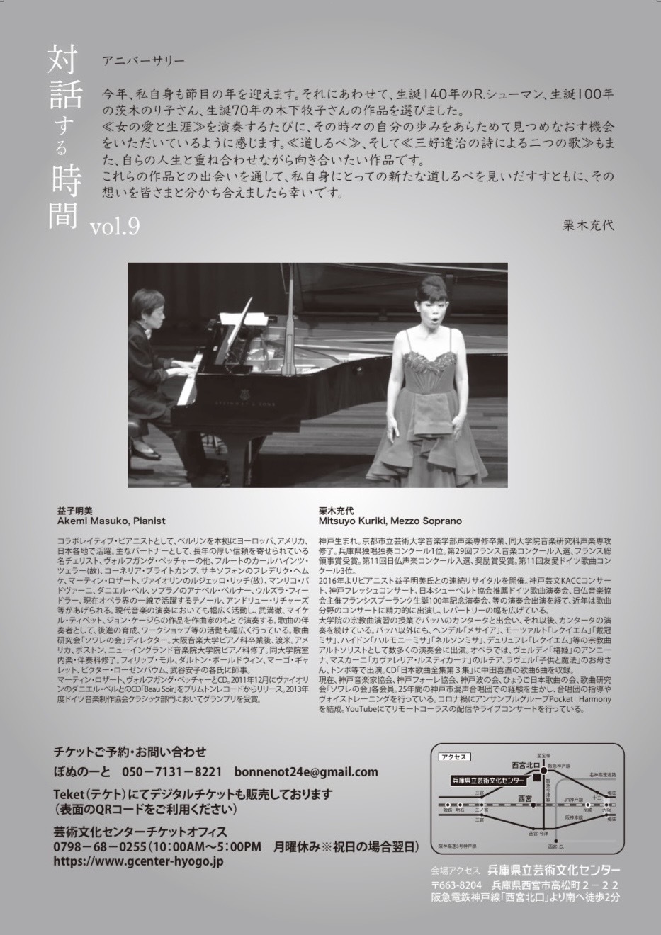 今年、私自身も節目の年を迎えます。それにあわせて、生誕140年のR.シューマン、生誕100年の茨木のり子さん、生誕70年の木下牧子さんの作品を選びました。