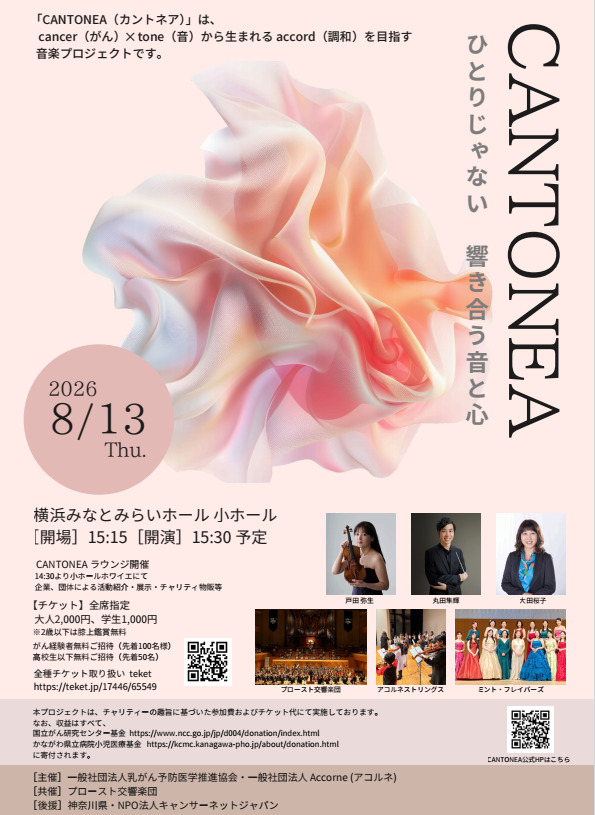 「CANTONEA(カントネア)」は、“cancer(がん)✕tone(音)”から生まれるaccord(調和)を目指す音楽プロジェクトです。本事業はオーケストライベントの開催を通じて、音楽の力でがん患者の皆様、ご家族、そして地域社会に感動と希望を届け、がんと向き合う方々が安心して参加できる場をつくり、地域の中で支え合う関係性を育むことを目的としています。既存の支援システム(自治体など)を紹介することで、支援の輪を広げ孤立を防いでいくことを目指した新しいチャリティ事業です。がん患者の方々やそのご家族、がん啓発活動に関心のある方々が、事前公募により演奏者として参加できるほか、楽器の演奏ができない方も合唱に加わることができる、会場全体が一体となる参加型企画です。