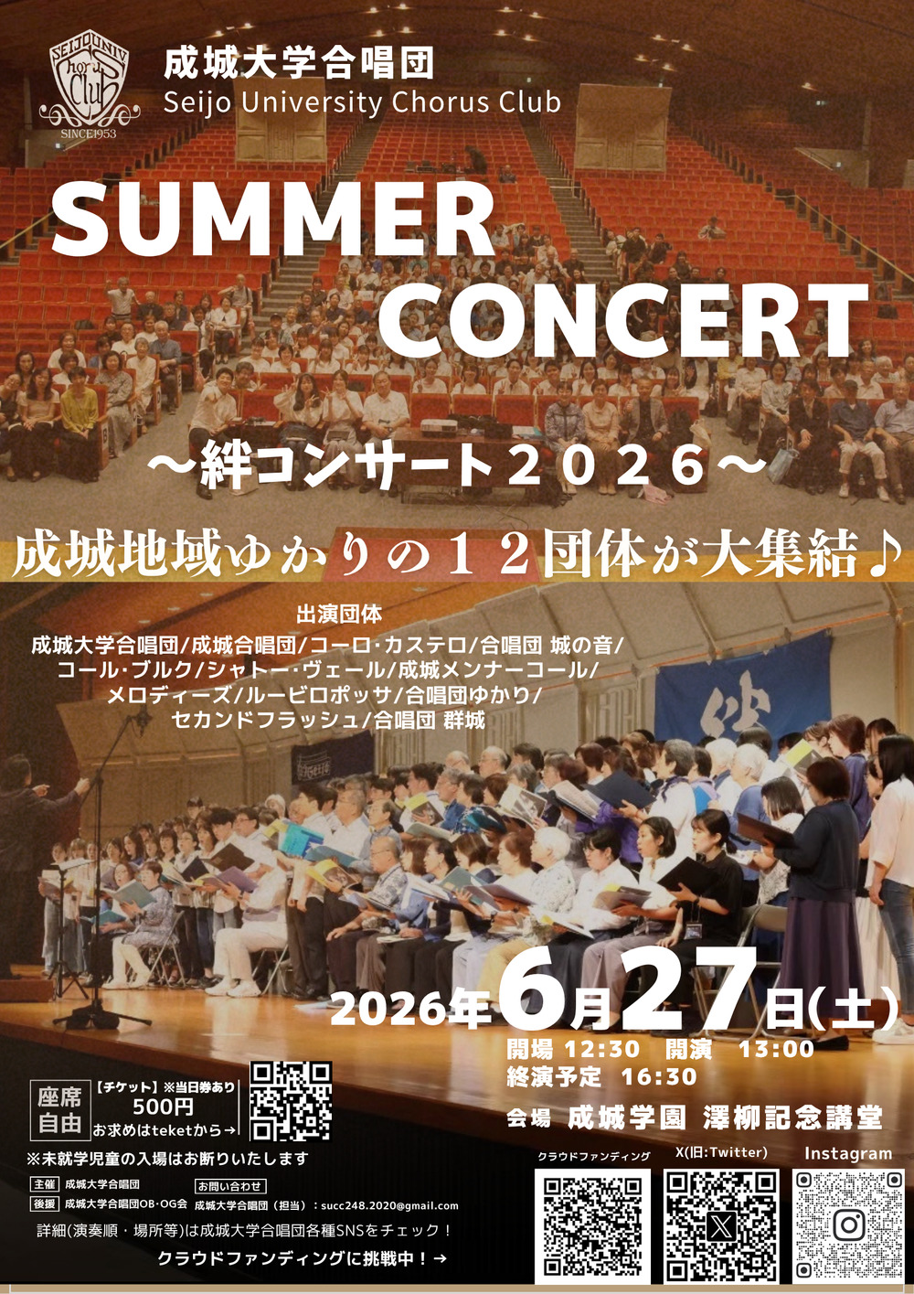 本公演は、成城学園ゆかりのコーラスグループが一同に会するオムニバスコンサートです。昨年に続いて今年も12団体が参加いたします。現役の大学生、大学合唱団OB・OG、成城合唱団、成城学園教職員&事務局、そのメンバーから生まれた新しいグループの総勢約200名が「絆」を深め、音楽と心のハーモニーを実感できる素晴らしい空間となることでしょう。本編の最後には、ご来場の皆様と出演者全員で歌う全員合唱のコーナーがございます。 是非、一緒に歌いましょう♪ 詳細は成城大学合唱団の各種SNSをチェック!