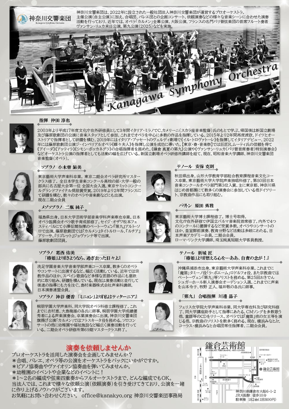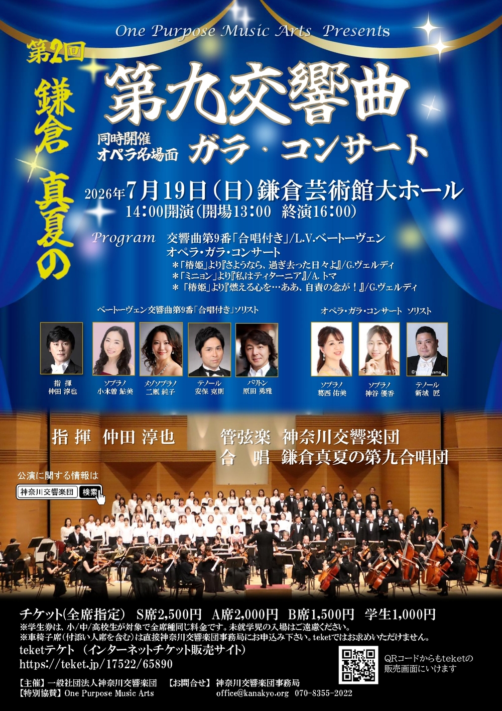 設立5年目を迎えるプロオーケストラ神奈川交響楽団による「第2回鎌倉・真夏の第九」とオペラ・ガラ・コンサートの豪華カップリング。一般的な第九公演では、第九の前プログラムは序曲などを前座的にやるだけですが、本公演ではオペラ・ガラを実施。前プロといえども本気度が違います。合唱団は一般公募による合唱団ではありますが、合唱指導で定評のある川邊晶子氏の指導により、昨年実施した第1回第九では「合唱のレベルが高い」と話題となりました。