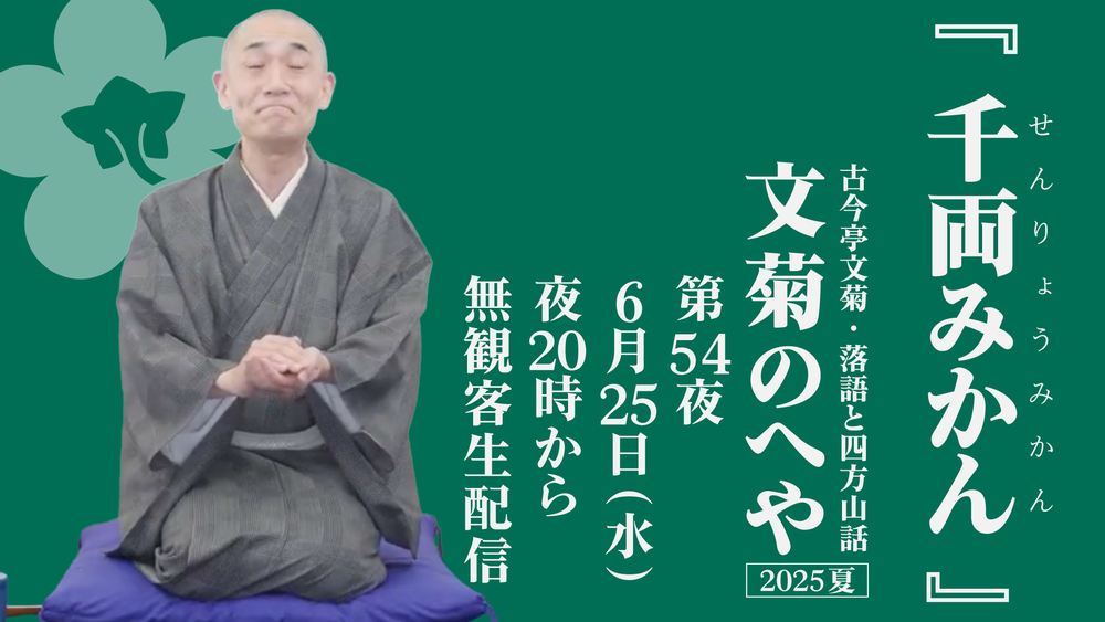 2025年6月25日(水)20:00より、無観客生配信にて落語家 古今亭文菊が落語を1席。落語の後には、普段着に着替えた師匠が、視聴者の皆さまからのお便りを取り上げながら、落語会後の打ち上げの雰囲気でとりとめのないアフタートーク「四方山話」をお届けします。ご視聴を心よりお待ちしております。