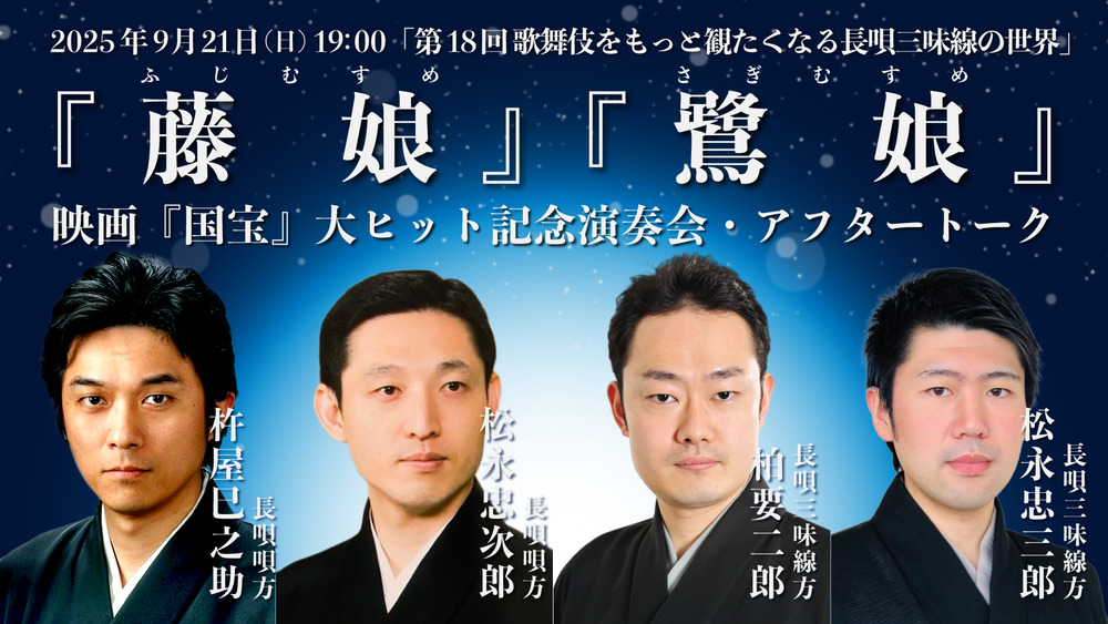 演奏演目は映画『国宝』の大ヒットにちなみまして、映画の中で非常に重要な演目として扱われておりました『藤娘』と『鷺娘』の2曲を豪華全編演奏!!