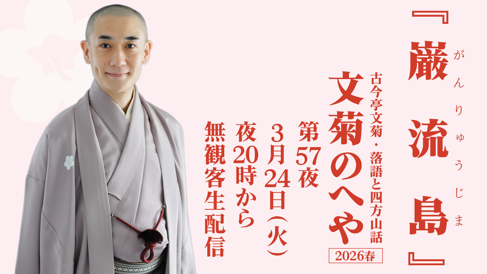 2026年3月24日(火)20:00より、無観客生配信にて落語家 古今亭文菊が落語を1席。落語の後には、普段着に着替えた師匠が、視聴者の皆さまからのお便りを取り上げながら、落語会後の打ち上げの雰囲気でとりとめのないアフタートーク「四方山話」をお届けします。ご視聴を心よりお待ちしております。