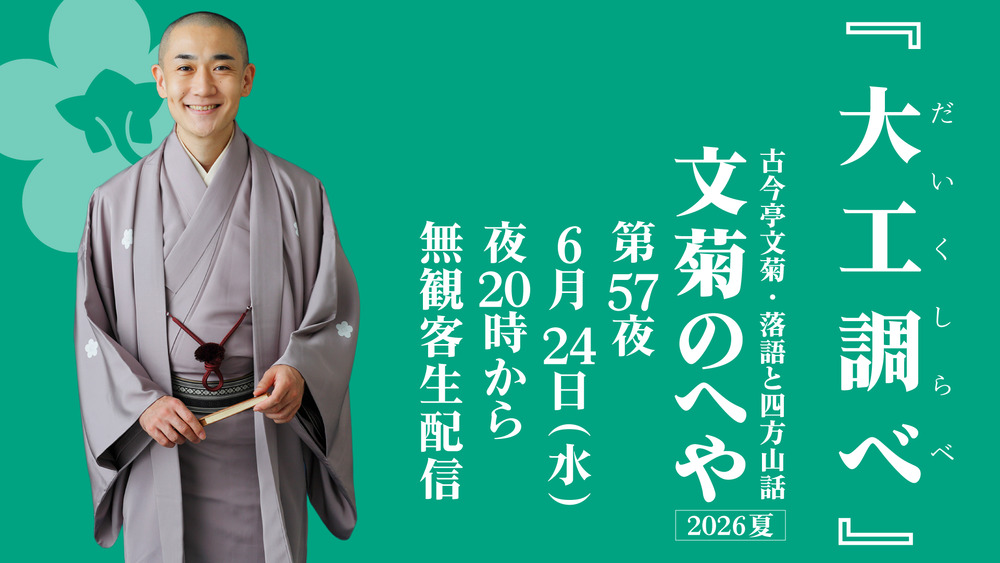 2026年6月24日(水)20:00より、無観客生配信にて落語家 古今亭文菊が落語を1席。落語の後には、普段着に着替えた師匠が、視聴者の皆さまからのお便りを取り上げながら、落語会後の打ち上げの雰囲気でとりとめのないアフタートーク「四方山話」をお届けします。ご視聴を心よりお待ちしております。
