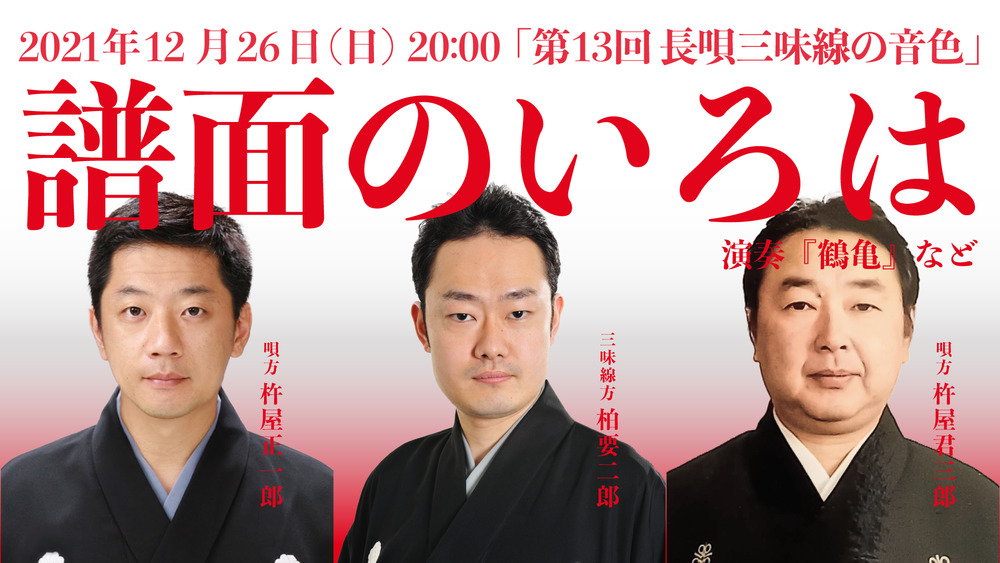 2021年12月26日(日)20:00より、無観客生配信にて長唄三味線方の柏要二郎さんによる「第13回 長唄三味線の音色・譜面のいろは」をお届けします。長唄の演奏と視聴者の皆さまからのご質問やご感想に答える時間を設けた、およそ90分の番組です。