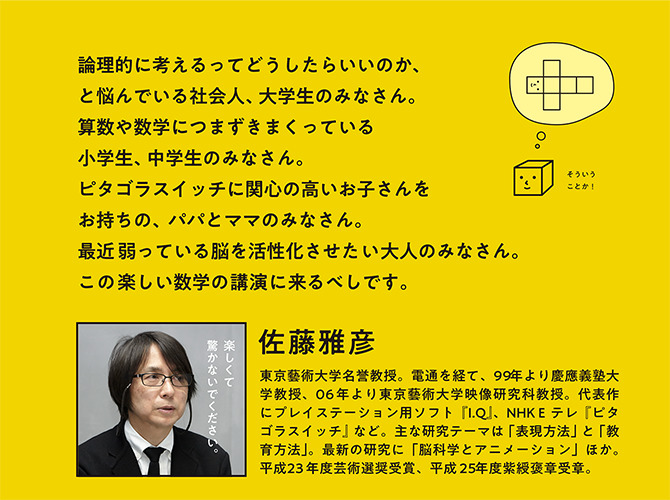 慶應義塾大学と東京藝術大学で教鞭をとり、「ピタゴラスイッチ」を作ってきた佐藤雅彦が、来場のみなさんに面白くも考えさせる問題を映像で投げかけます。