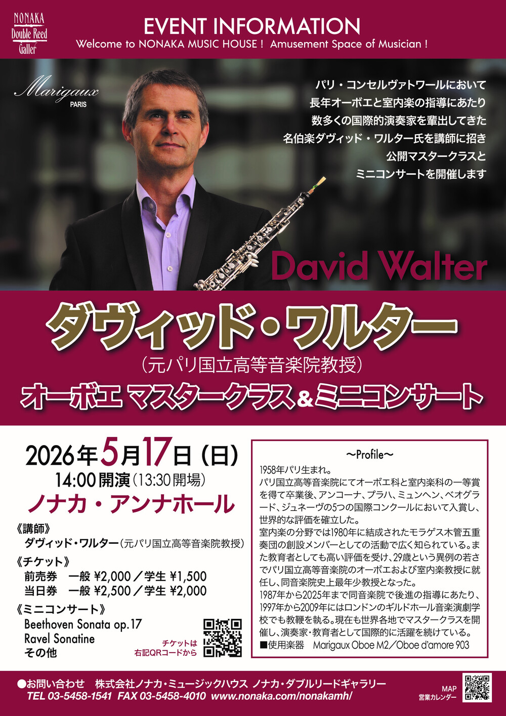 パリ・コンセルヴァトワールにおいて長年オーボエと室内楽の指導にあたり、数多くの国際的演奏家を輩出してきた名伯楽ダヴィッド・ワルター氏を講師に招き、公開マスタークラスとミニコンサートを開催します。
