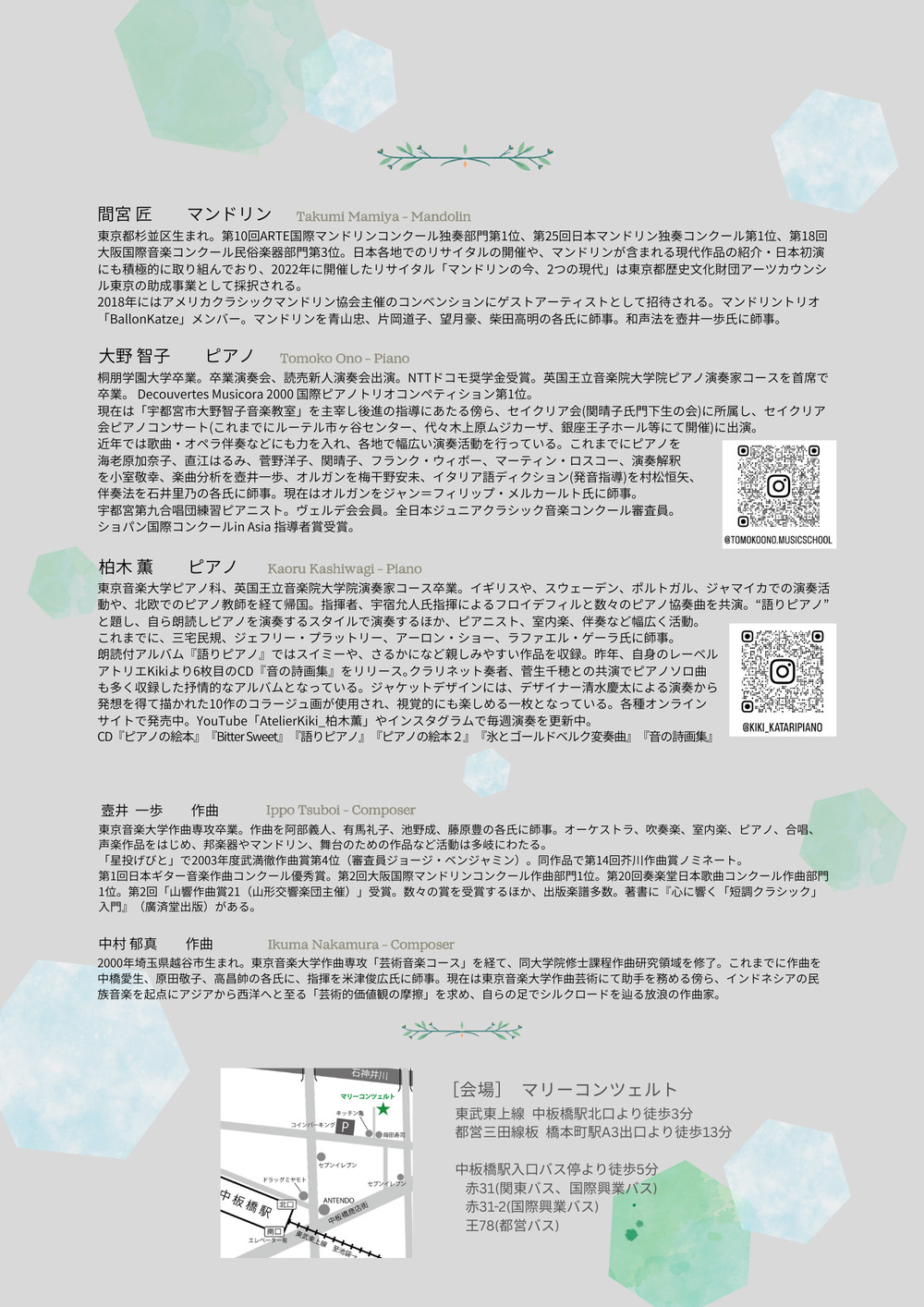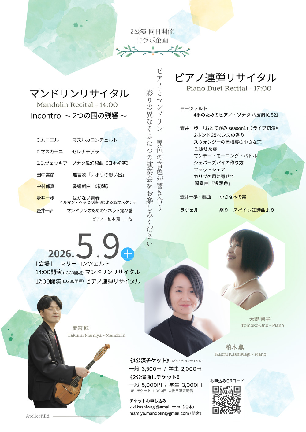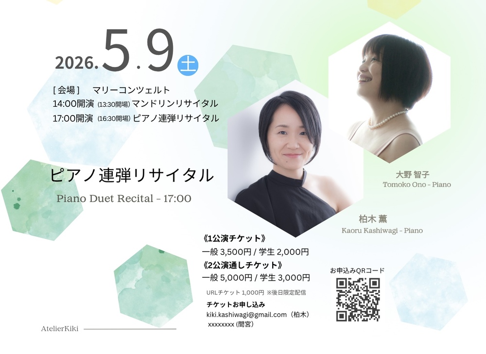 英国王立音楽院卒業の2人のピアニスト、大野智子と柏木薫で贈る色鮮やかな春のコンサートです。オンライン初演で続けてきた、作曲家の壺井一歩さんとの3人で発表してきた作品集「おとてがみ」の初のライブ初演をはじめ、モーツァルトの名曲、そしてラヴェルの「祭り」など、盛り上げて参ります🎶