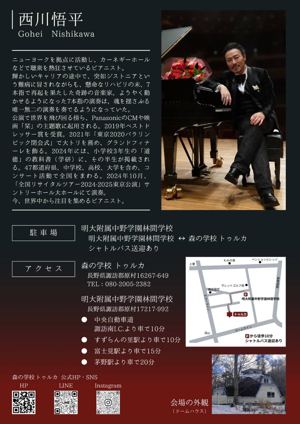 奇跡のピアニスト、西川悟平氏が、森の中のオルタナティブスクールにやってきます。 指の難病を乗り越えた彼から紡ぎ出されるのは、技術を超えた「魂」の音色。心揺さぶる演奏と温かなトークが、明日への勇気を届けてくれます。