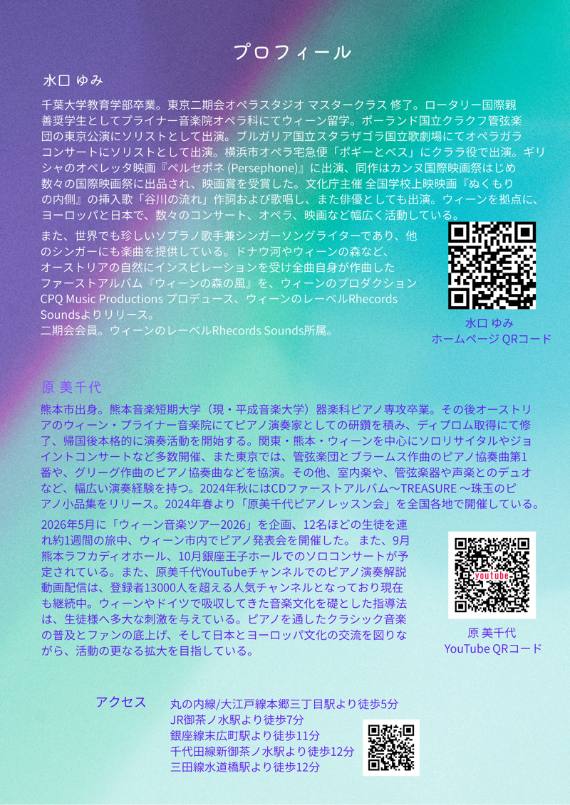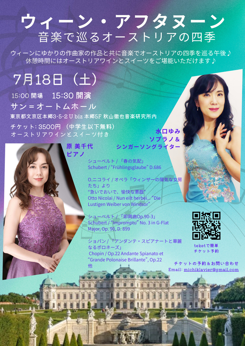 ウィーン在住のソプラノ歌手の水口ゆみと、ウィーンで研鑽を積み日本で活動中のピアニスト原美千代が贈る、ウィーンな午後「ウィーン・アフタヌーン」♪休憩中には、オーストリアワインとスイーツをご堪能いただきながら、ウィーンゆかりの作曲家の作品と共に音楽でオーストリアの四季をご一緒に巡りましょう!