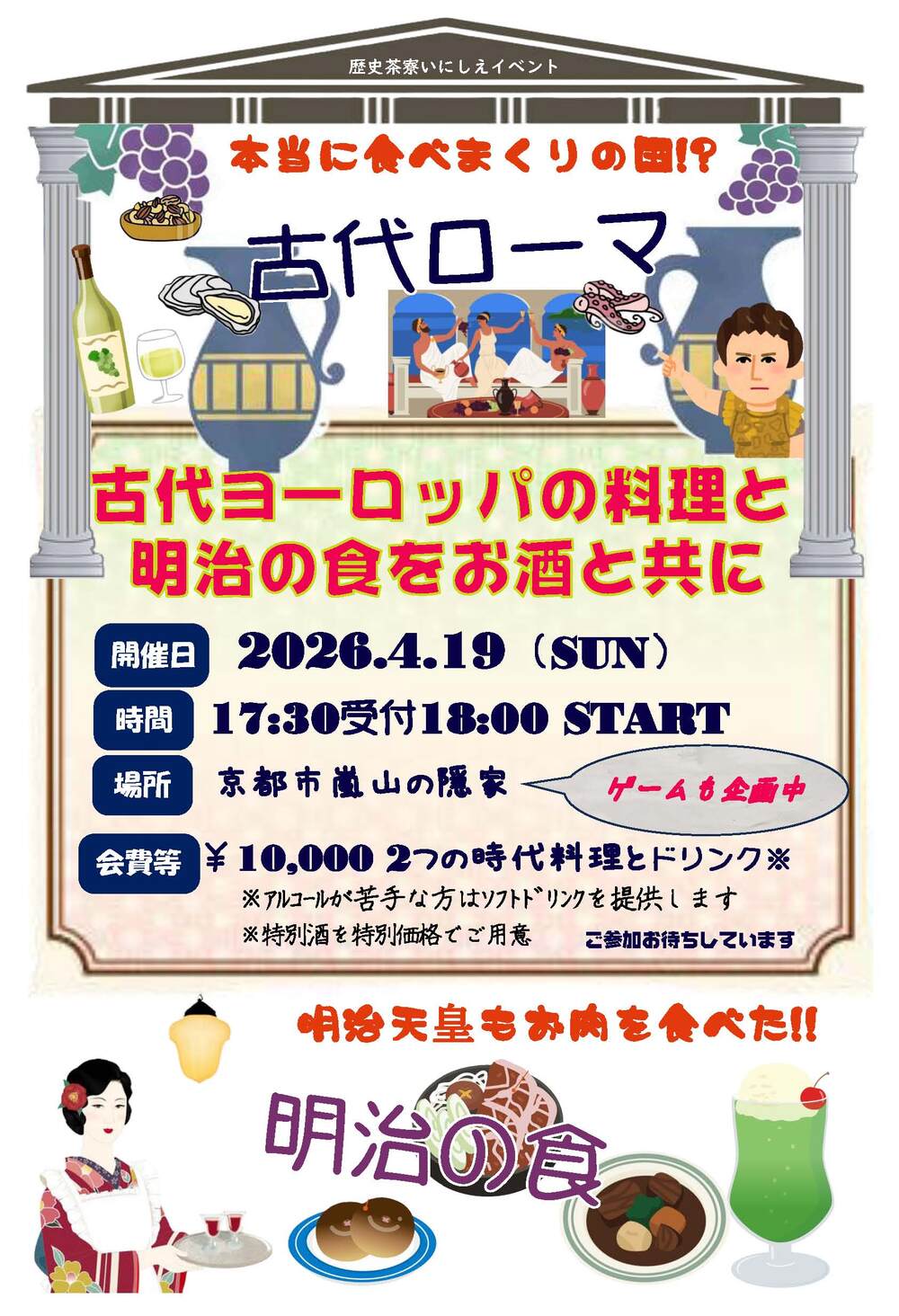 古代ローマと明治時代の料理をコース仕立てで提供します。