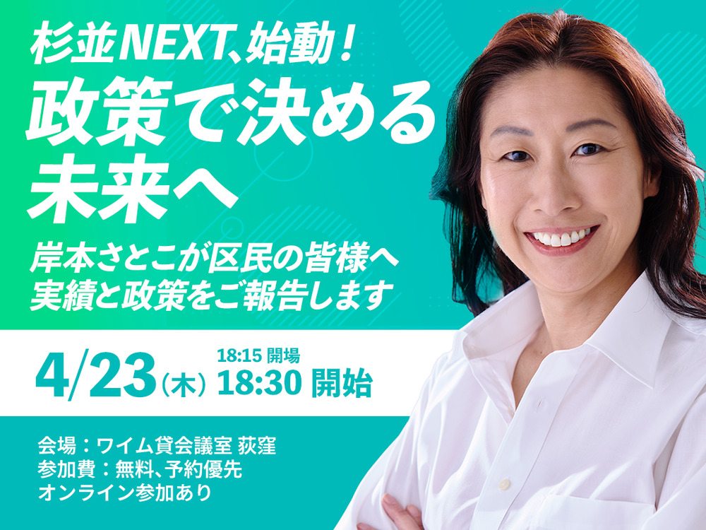 このたび、対話の区政をさらに進め、安心と希望を実感できる杉並をつくるため、岸本さとこが4年間の実績と今後の区政運営に向けた政策を皆様にご報告いたします。あわせて、政策本位の議論が損なわれている昨今の政治の環境についても、皆様と広く問題意識を共有したいと考えています。