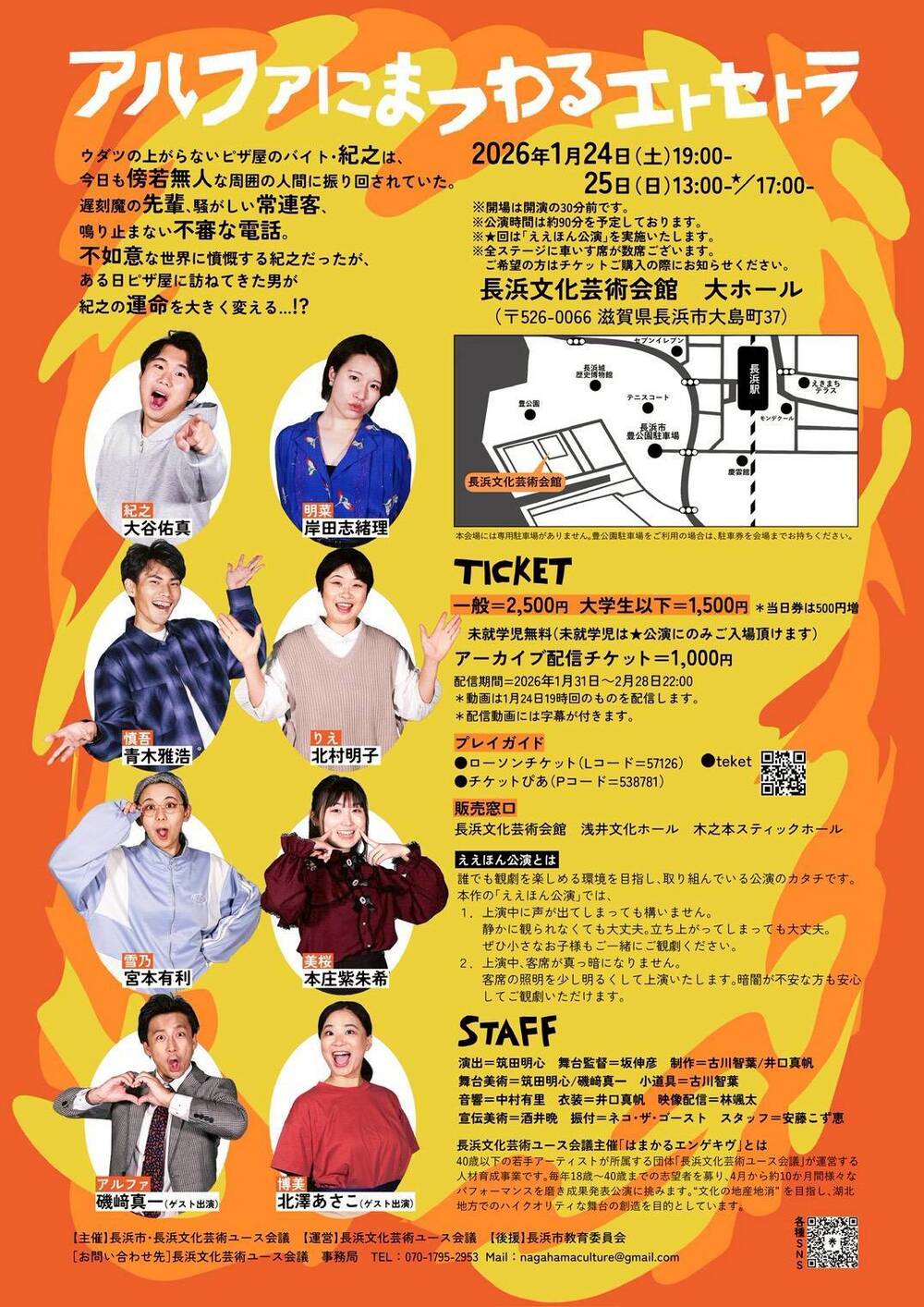 「はまかるエンゲキヴ」は、地域で本格的に活動する俳優を目指す人材のために始まった人材育成プログラム。ここでは、自身の現状の技術力と向き合い、さらに自分に挑戦することを目標としています。今年は湖北地方より6人の参加者が集まり、同じく湖北地方で活躍されている磯﨑真一さん(NPO法人はまかる)・北澤あさこ(劇団プラネットカンパニー)さんをゲストに迎え、学び、教え合い、2025年4月より稽古を重ねてきました。