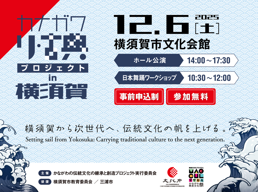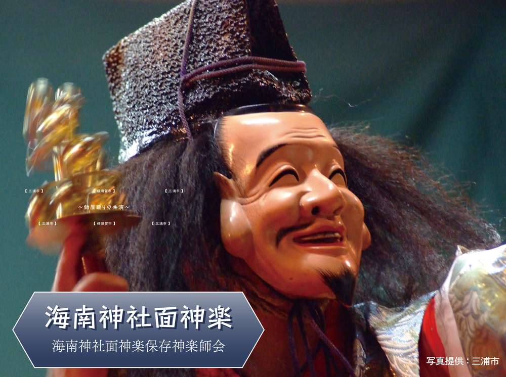 「海洋都市横須賀」を舞台に三浦半島の暮らしに根差した伝統芸能の公演を行います。ユネスコ無形文化遺産「チャッキラコ」や、300年以上の歴史を持つ「虎踊り」、海南神社に奉納される「海南神社面神楽」のほか、「飴屋踊り」の発祥とされる千葉県「白桝粉屋おどり」と、三浦半島の飴屋踊りが共演します。