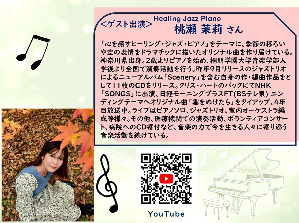 今回はゲストとしてHealing Jazz Pianist 桃瀬茉莉さんをお呼びしての開催となります。オフィシャルHPはこちら⇒https://marimomose.com/index.html