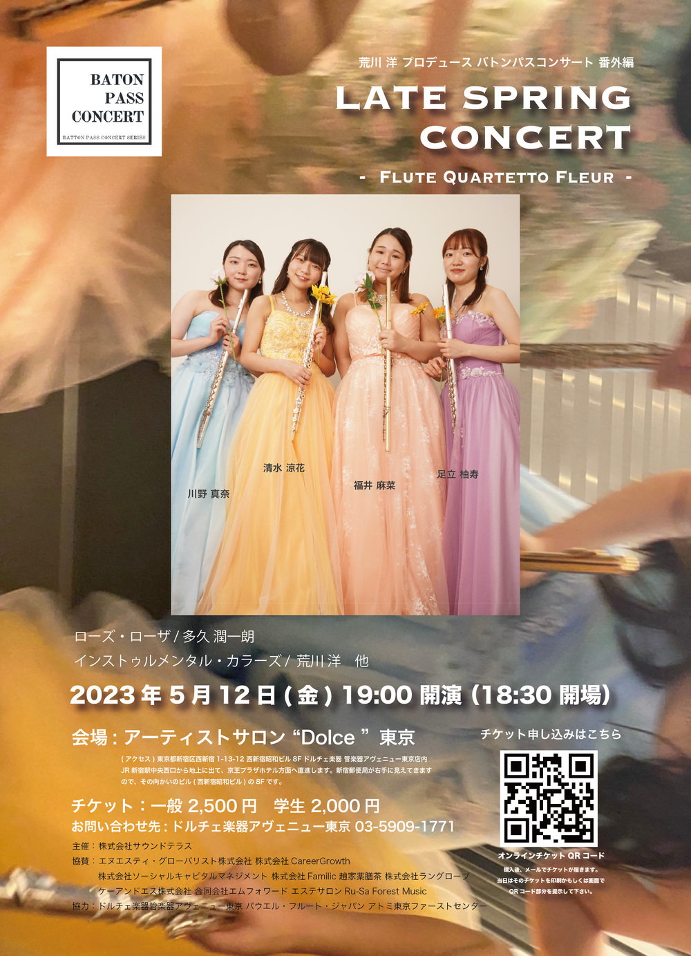 Batton Pass Concert(バトン・パス・コンサート)は、夢を持ち、これから活躍していくアーティストを応援するために起ち上げたプロジェクトです。こちらからアーティストを招聘する方式ではなく、アーティストがアーティストを紹介し繋がっていくコンサートです。師匠・荒川洋がプロデュースする洗足学園音楽大学出身4人組、春のコンサートです。4本のフルートとピッコロ、アルトフルートも加えた編成でお届けいたします。