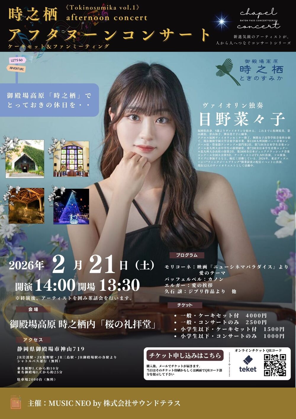 イルミネーションでおなじみの御殿場高原 時之栖内のチャペル、桜の礼拝堂で極上の音楽を・・・終演後は、アーティストを囲み茶話会を開催いたします。