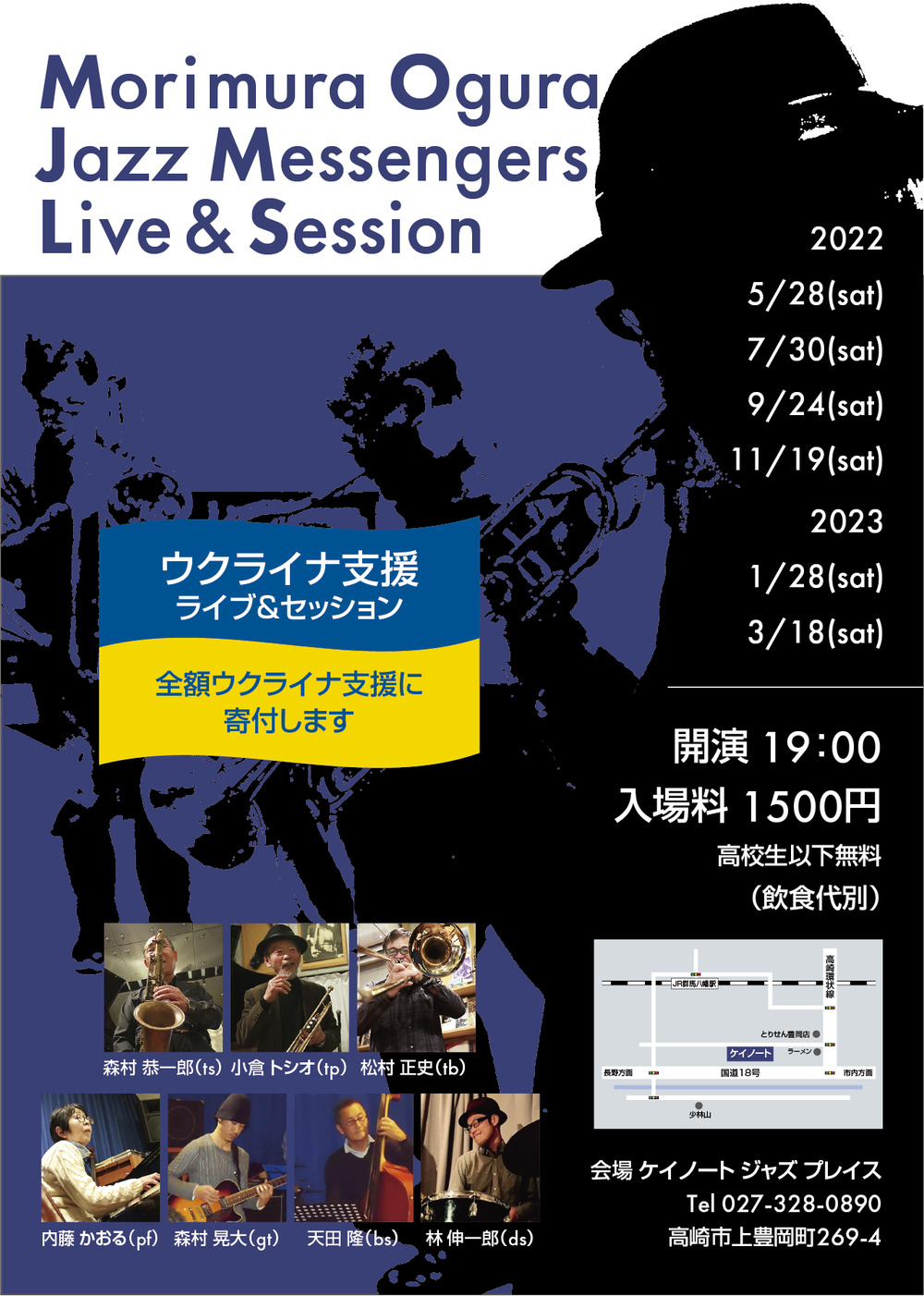 Morimura Ogura Jazz Messengers 森村 恭一郎(ts)と小倉 トシオ(tp)を中心としたジャズバンド。チケット代全額をウクライナ支援に寄付します。