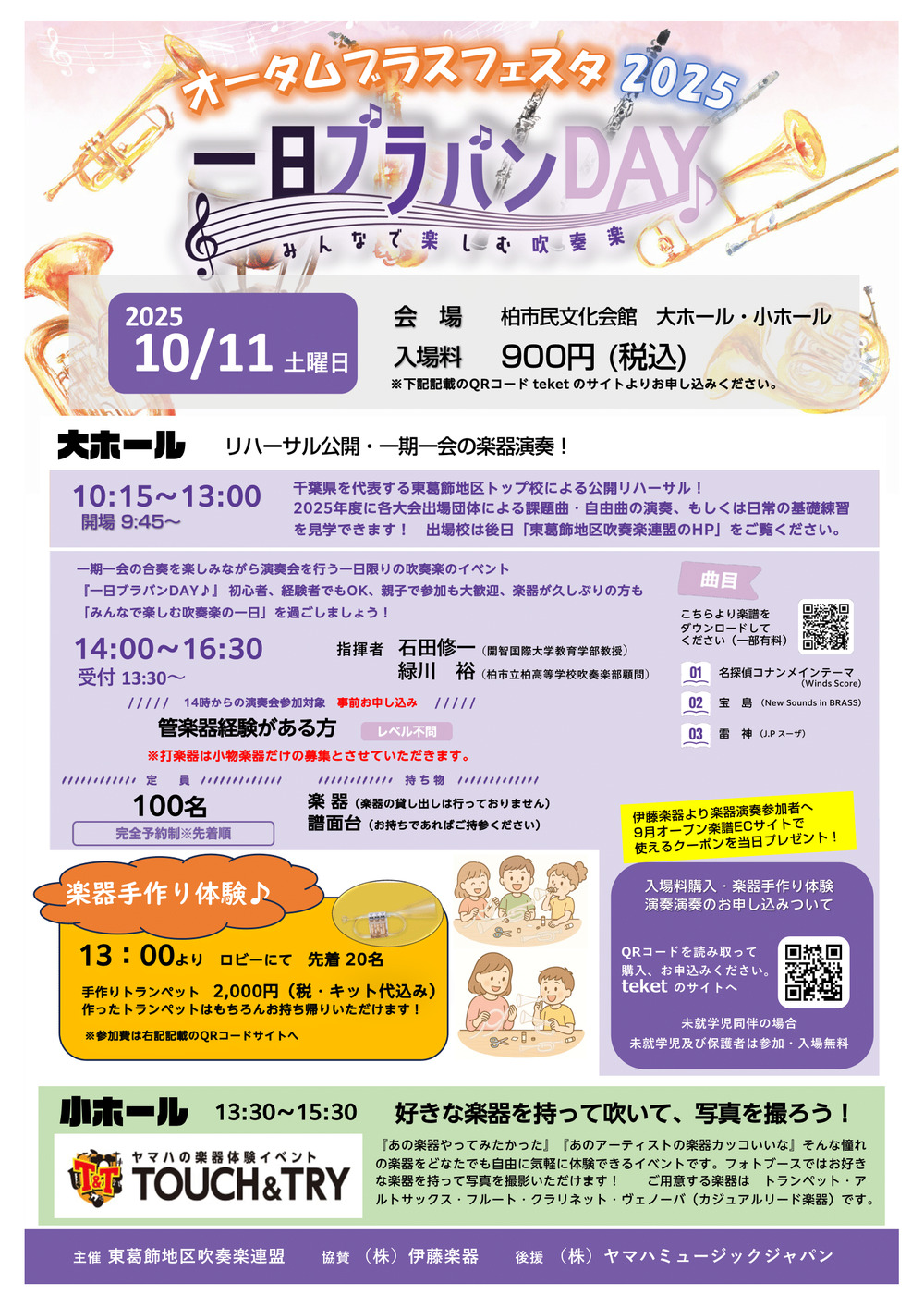 14:00からはお好きな楽器をお持ちいただき、一期一会の合奏を楽しみながら一日限りの演奏会です♪初心者、経験者どちらもOK、親子での参加も大歓迎! 指揮指導は石田修一先生(開智国際大学)と緑川裕先生(柏市立柏高等学校)です!楽器は久しぶりの方も、「みんなで楽しむ吹奏楽の一日」を過ごしましょう!