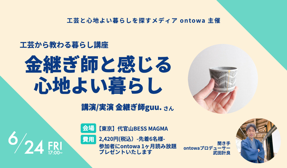 当日は、guu.さんが感じている、金継ぎの心地よさについても伺いながら、皆さまと心地よい暮らしを考え、感じてみたいと思います。