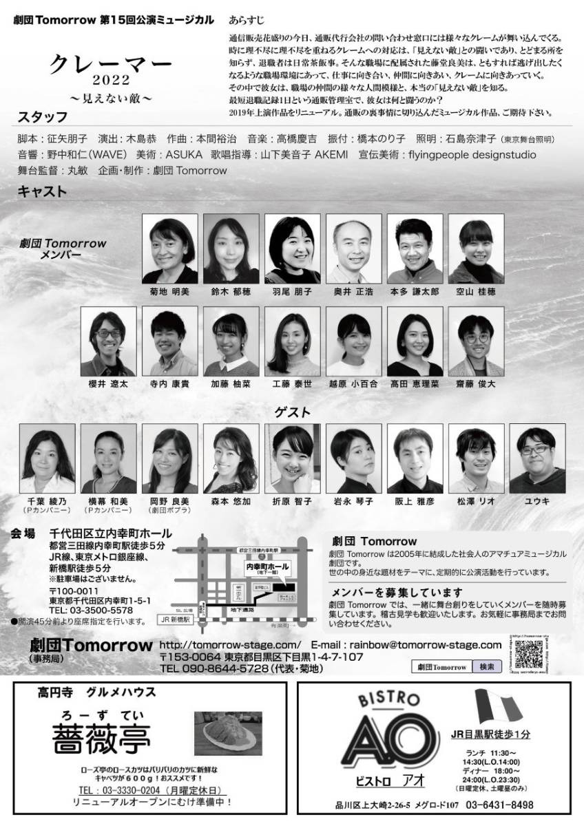 劇団Tomorrow第15回公演 ミュージカル クレーマー2022 ~見えない敵~