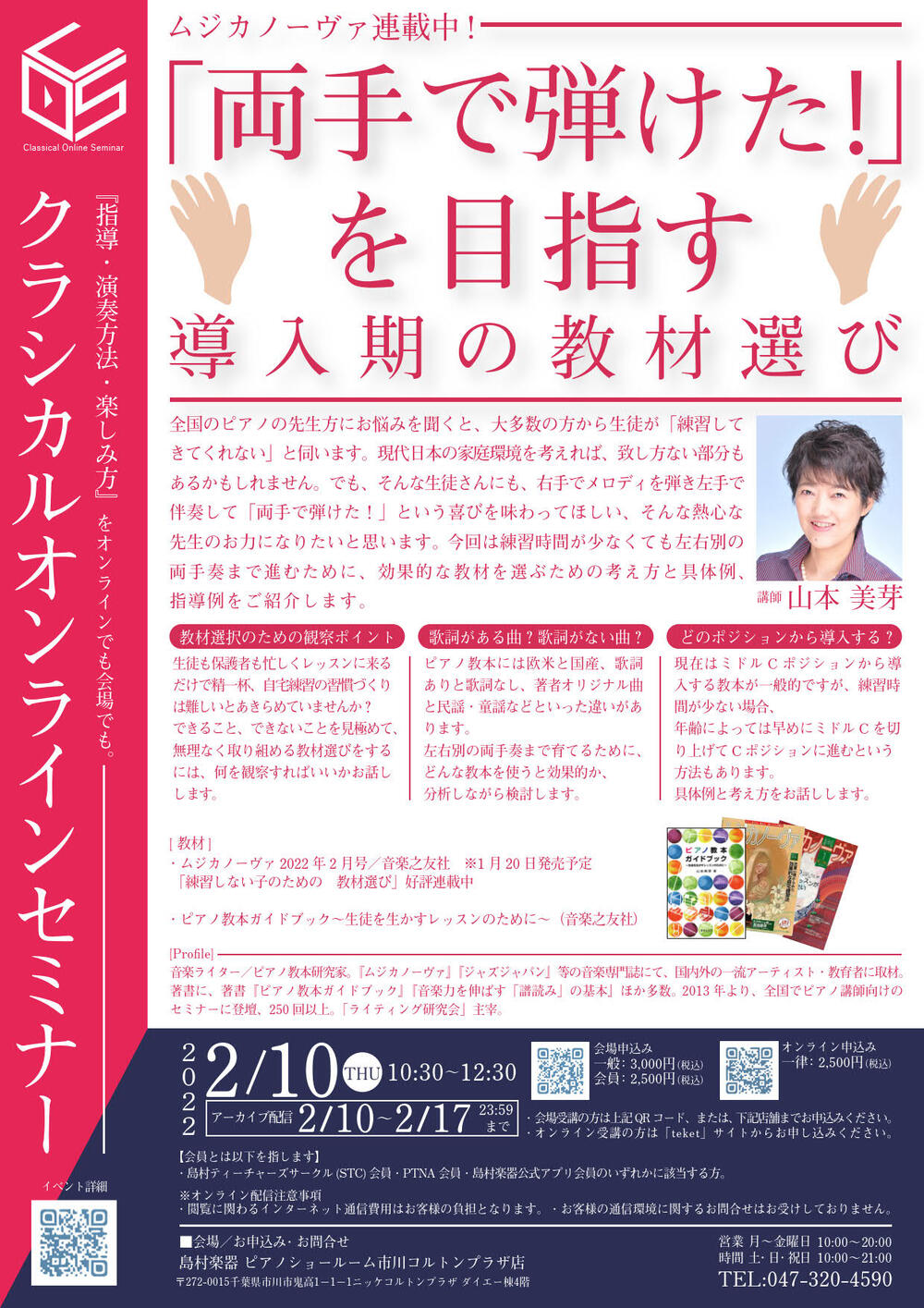 2022年2月、音楽ライター/ピアノ教本研究家、山本美芽先生をお迎えして開催した、『練習しない子のためのピアノレッスン - できた!を積み上げて両手同時奏まで導く - 』/出版:音楽之友社の書籍から『「両手で弾けた!」を目指す 導入期の教材選び』セミナーを、アーカイブ(録画)配信いたします。