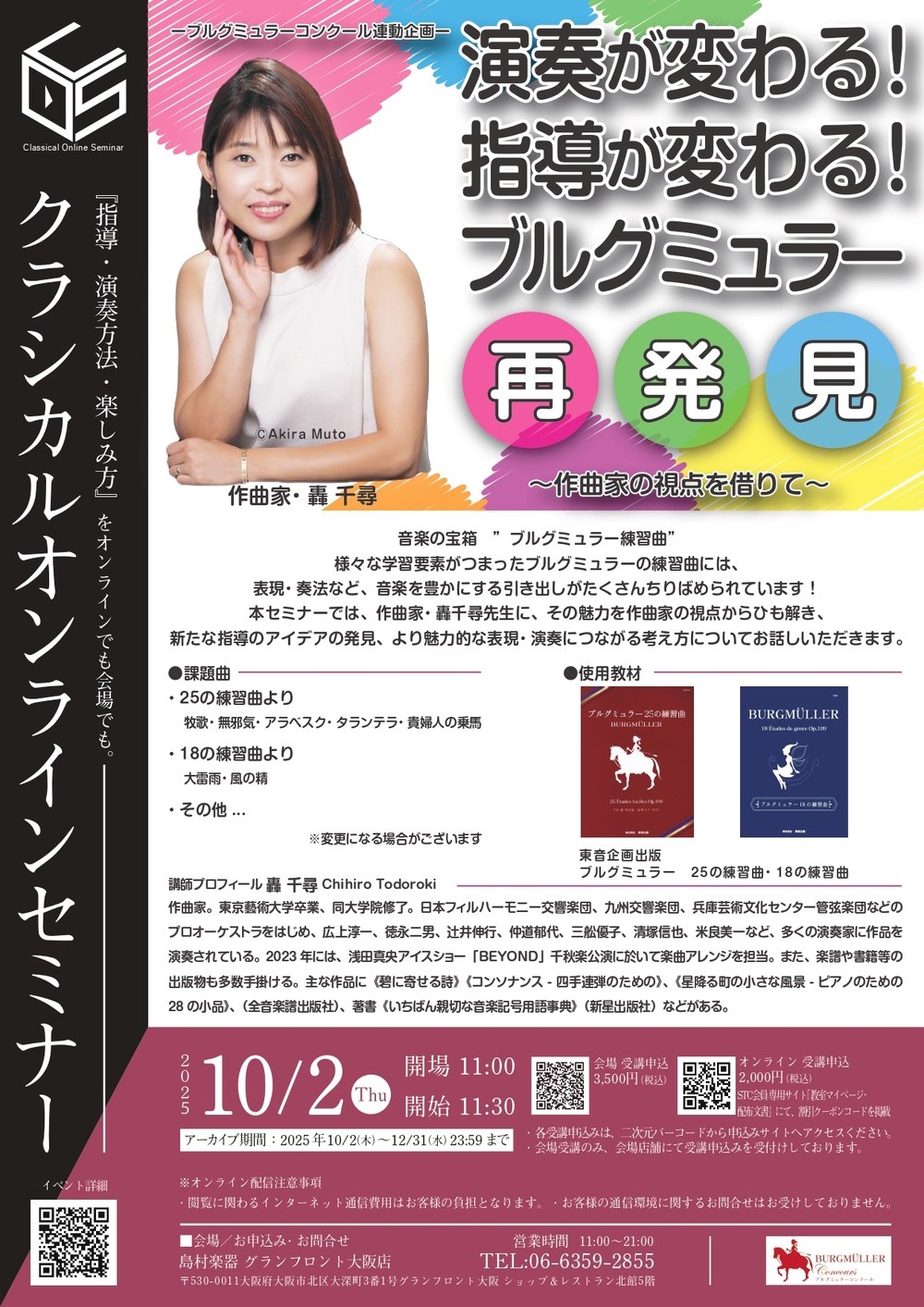 本セミナーでは、作曲家・轟千尋先生に、その魅力を作曲家の視点からひも解き、新たな指導のアイデアの発見、より魅力的な表現・演奏につながる考え方について、今最も人気の高い「ブルグミュラーコンクール」で人気の演奏曲を取り上げ、お話しいただきます。