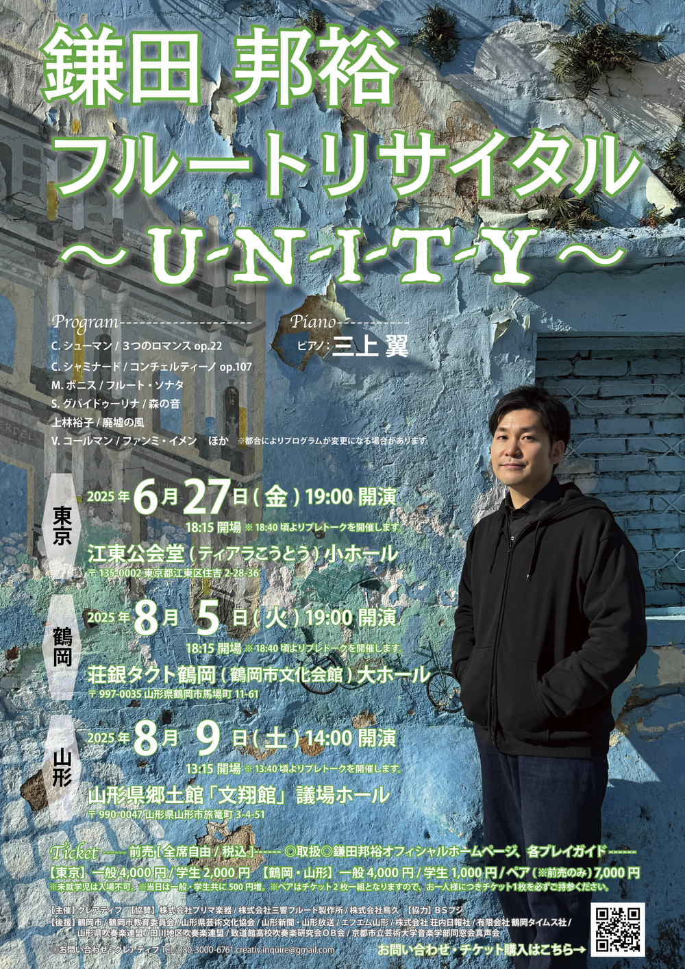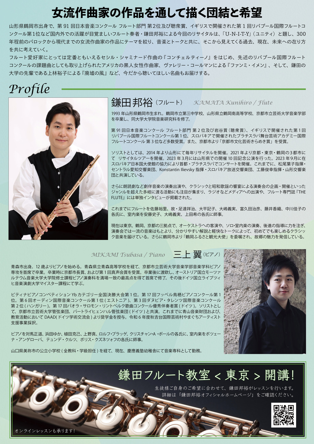 ⼭形県鶴岡市出⾝で、第 91 回⽇本⾳楽コンクール フルート部⾨ 第2位及び聴衆賞、イギリスで開催された第 1 回リバプール国際フルートコンクール第1位など国内外での活躍が⽬覚ましいフルート奏者・鎌⽥邦裕による今回のリサイタルは、「U-N-I-T-Y」 (ユニティ)と題し、300 年程前のバロックから現代までの⼥性作曲家の作品にテーマを絞り、⾳楽とトークと共に、そこから⾒えてくる過去、現在、未来への在り⽅を共に考えていく。