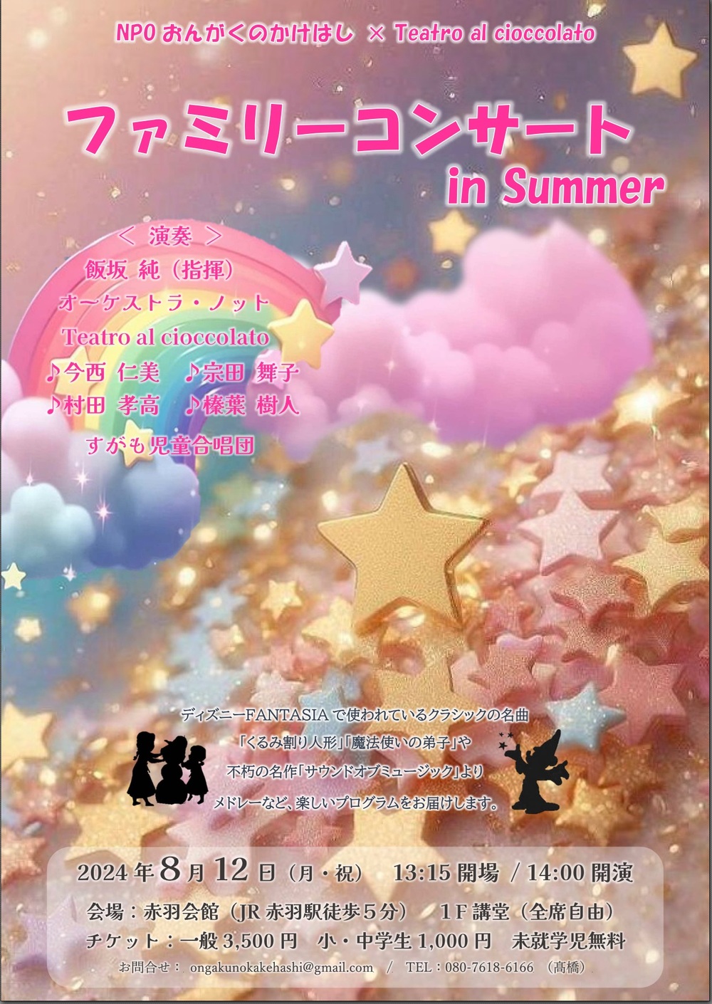 今回は主催団体「オーケストラ・ノット」とこれまでに多数共演をさせていただいてきたプロの歌手団体「Teatro al Cioccolato」さん、「すがも児童合唱団」さんとの共演で、ディズニーの映画中で使用された曲を主体としたファミリーコンサートを行います。