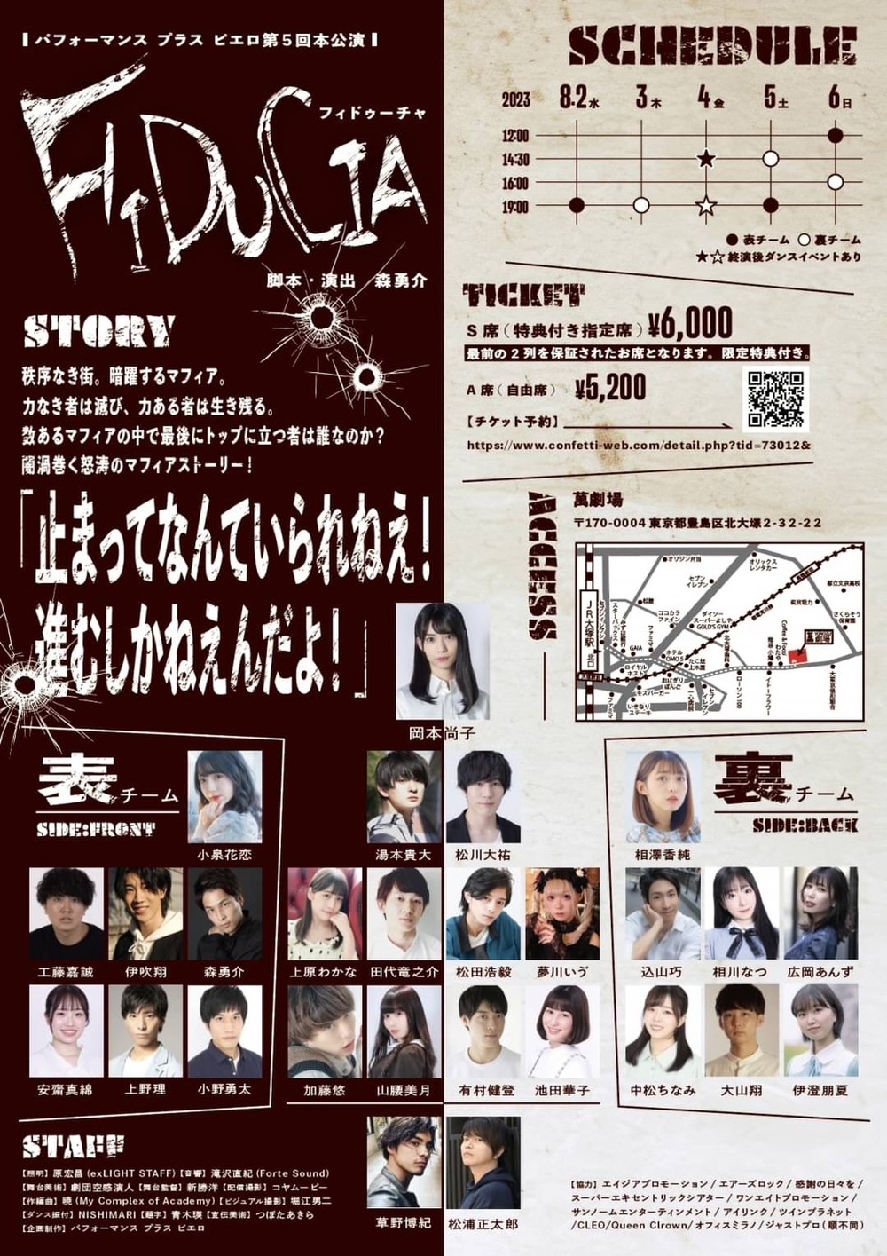 2023年8月2日~6日に萬劇場で行われるパフォーマンスプラスピエロ第5回本公演『FIDUCIA-フィドゥーチャ-』表チームを収録した映像を配信いたします。