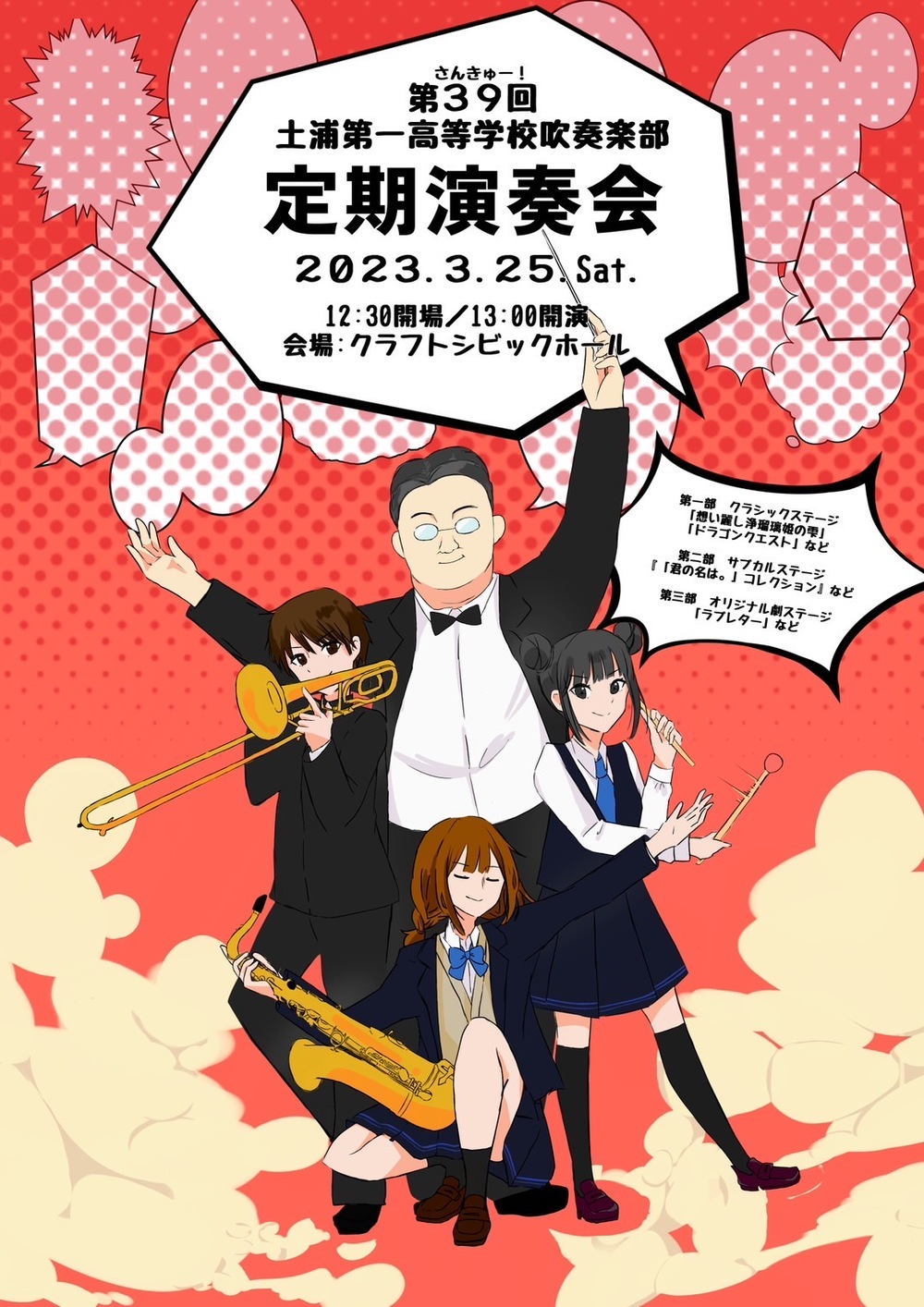 今年も定期演奏会を開催いたします!1年間の集大成であり、2年生の引退公演でもあります。クラシック曲から来年度のコンクール演奏予定曲、聞き馴染みのあるポップス曲まで幅広い演奏をぜひお楽しみください!