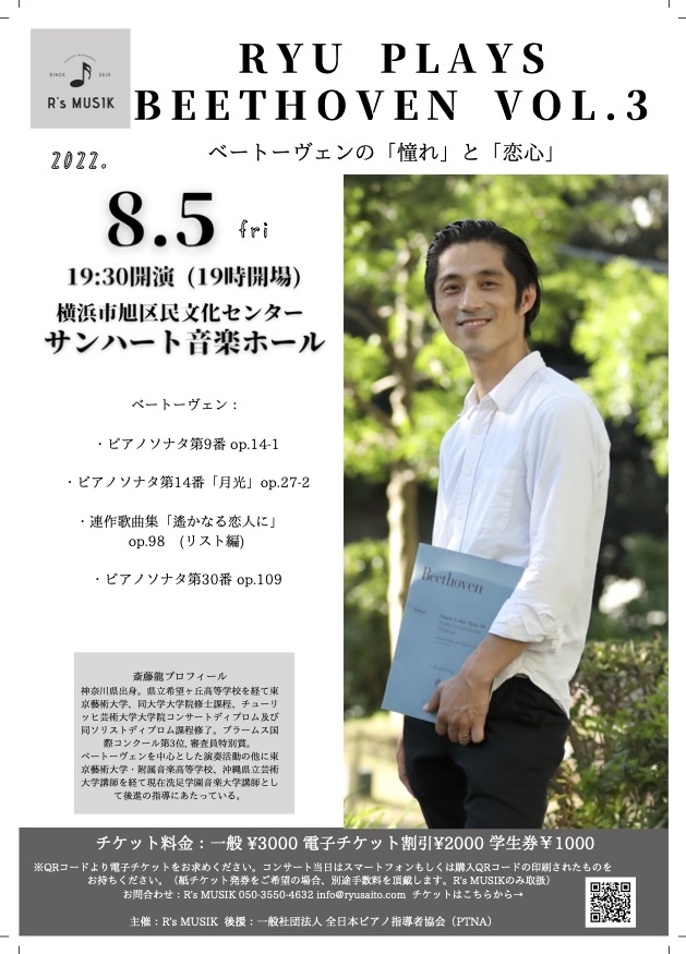 ベートーヴェンに定評のあるピアニスト、斎藤龍がお送りするベートーヴェンソナタ全曲チクルスの第3弾。