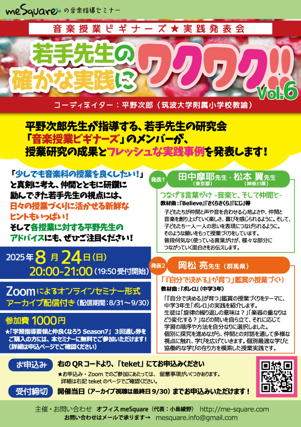 本セミナーでは、有望な若手先生3名による、音楽科授業の実践事例をご紹介します!