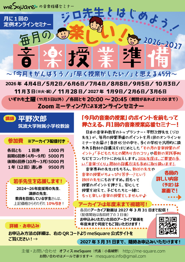 日本の音楽科教育のトップランナー・平野次郎先生が、毎月の授業準備のポイントを月1回のセミナーでお届け!