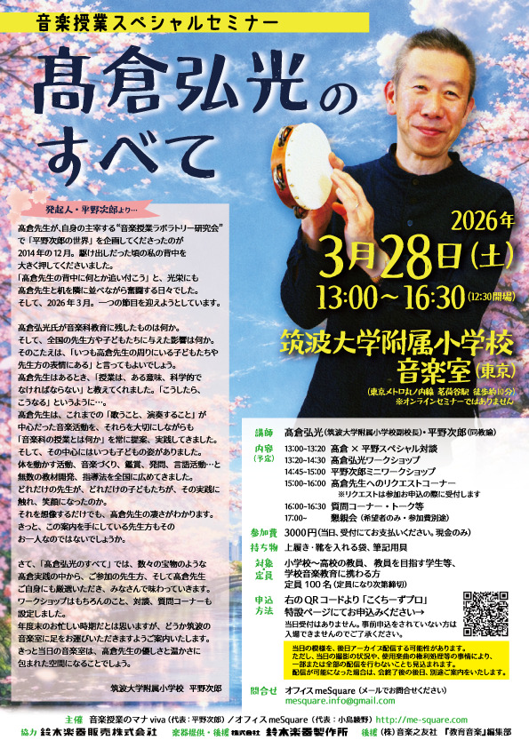 日本の音楽科教育を牽引してきた、筑波大学附属小学校の高倉弘光先生。今春、24年勤められた同小学校のご退任にあたり、スペシャルセミナーを開催しました!