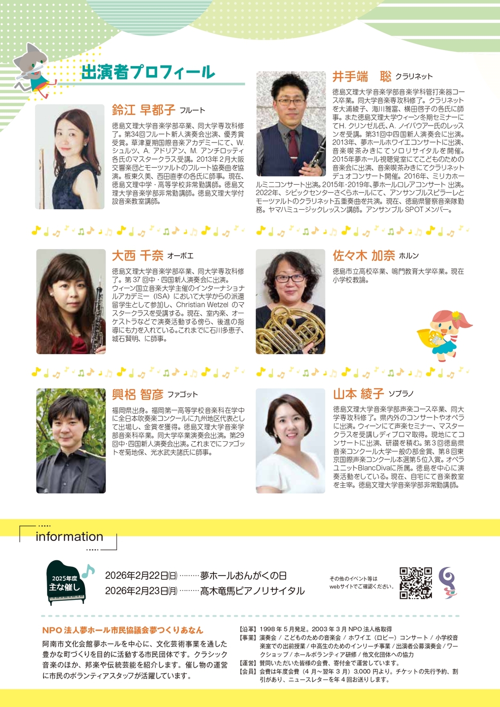 徳島文理大学音楽学部卒業、同大学専攻科修了。第34回フルート新人演奏会出演、優秀賞受賞。草津夏期国際音楽アカデミーにて、W.シュルツ、A.アドリアン、M.アンチロッティ各氏のマスタークラス受講。2013年2月大阪交響楽団とモーツァルトのフルート協奏曲を協演。板東久美、西田直孝の各氏に師事。現在、徳島文理中学・高等学校非常勤講師。徳島文理大学音楽学部非常勤講師。徳島文理大学付設音楽教室講師。