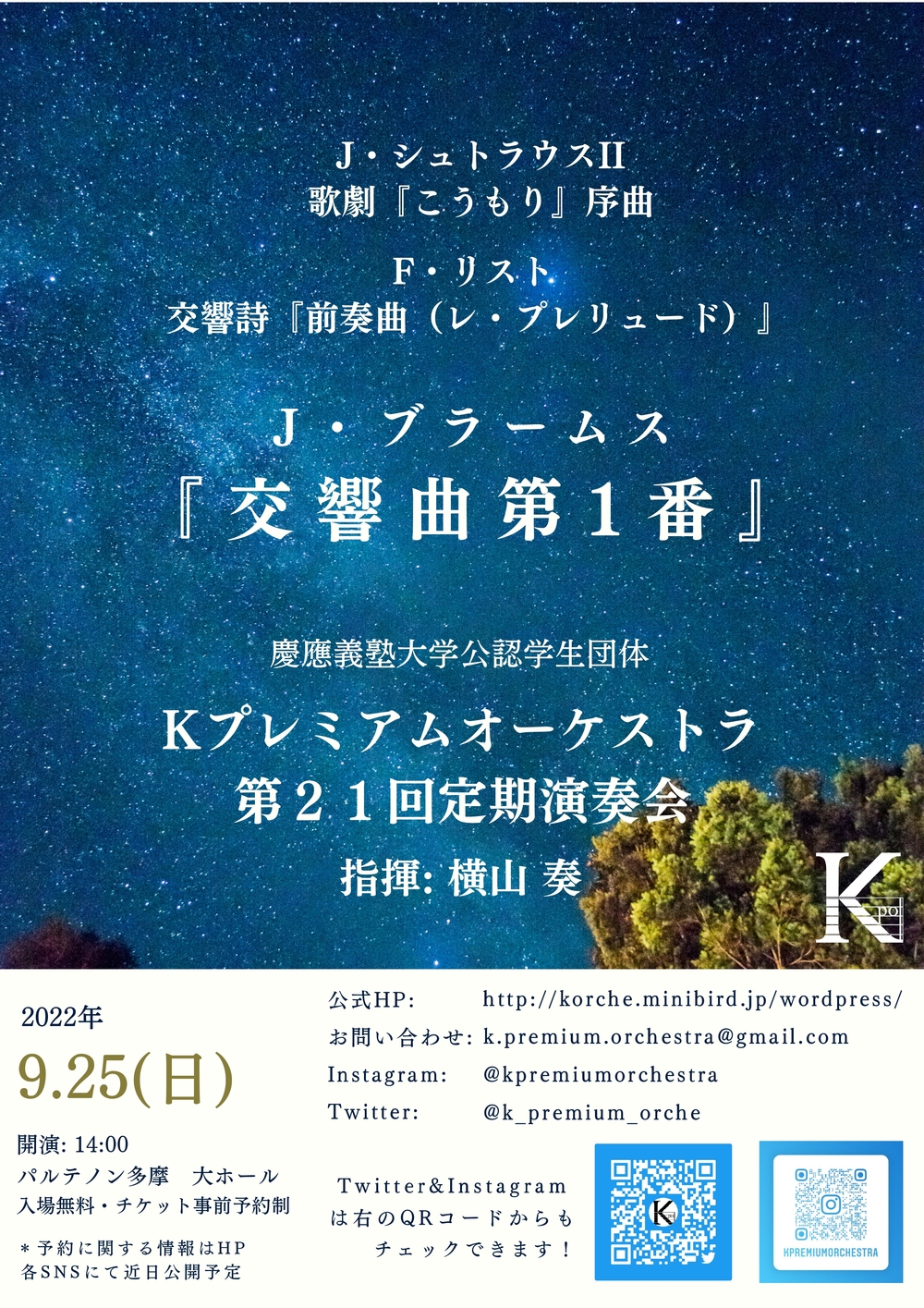 慶応義塾大学公認学生団体 Kプレミアムオーケストラ(Kオケ/KPO)です。 慶応義塾大学創立150周年を記念し、2008年に創立されました。 「時間的・金銭的理由からオーケストラへの入団をためらう学生にも演奏の場を」「すべての人に音楽で感動を」という理念のもと、主に年2回の定期演奏会に向け、活動しています。 現在、総勢約100名の団員が在籍しています。