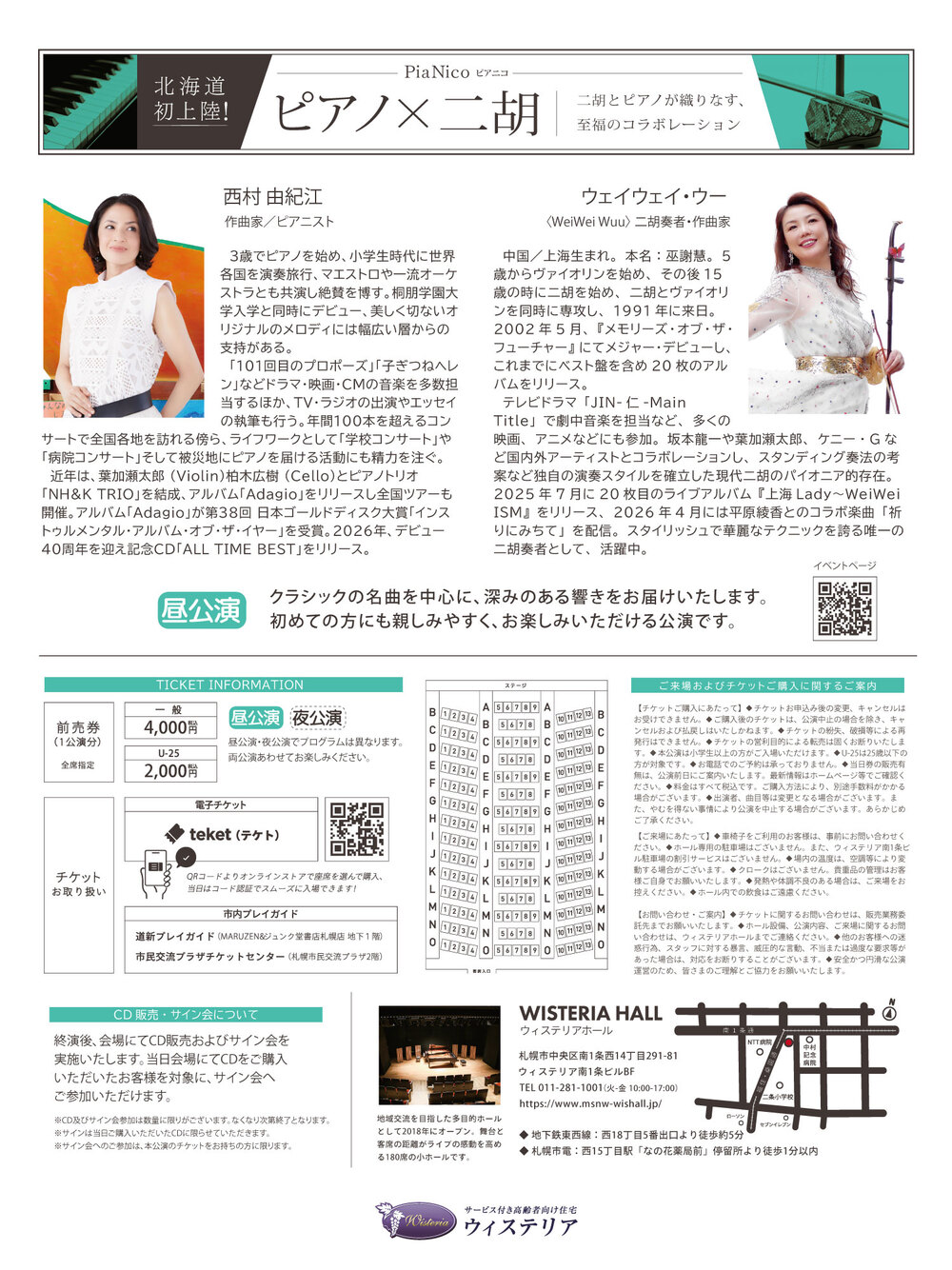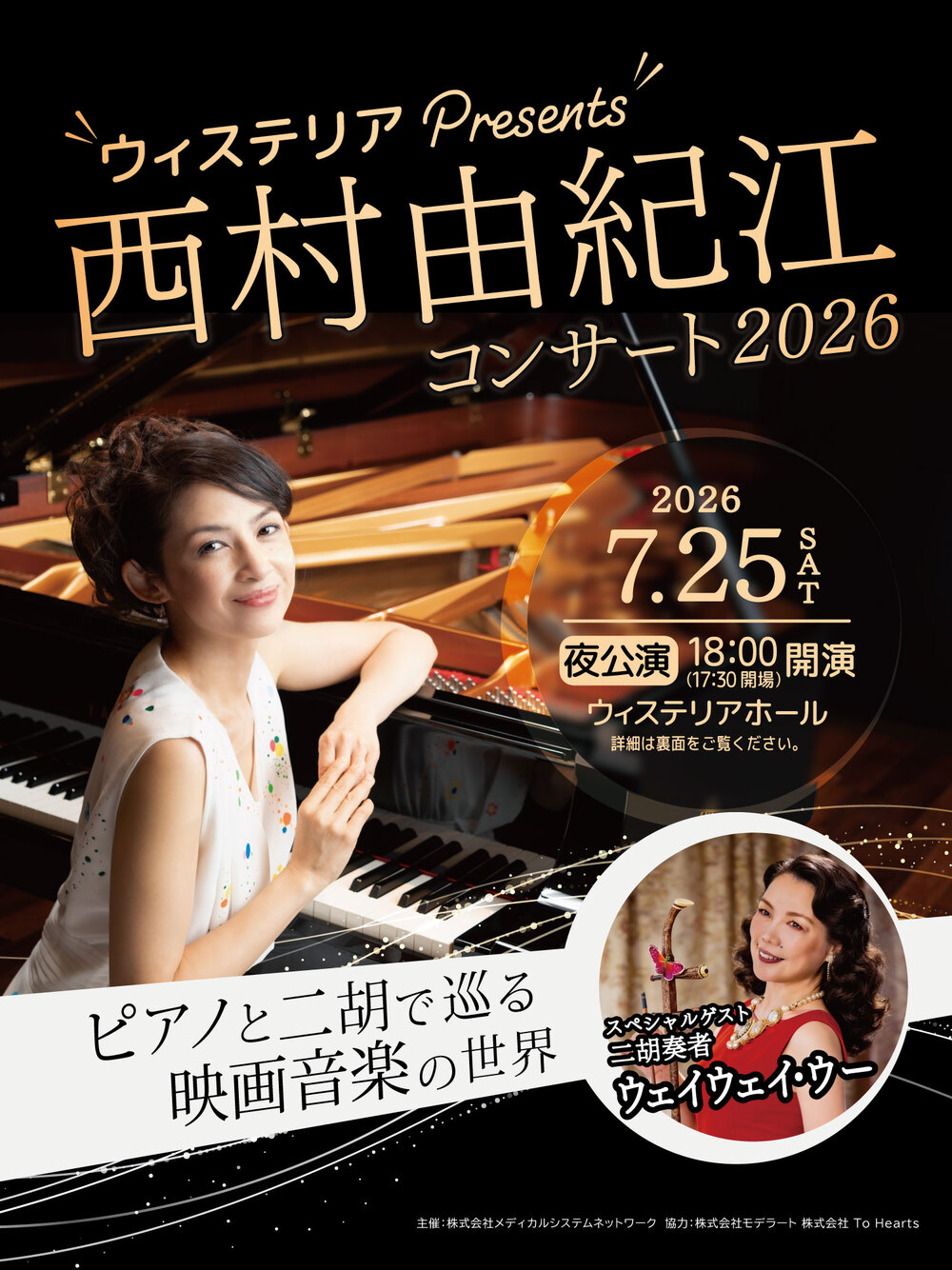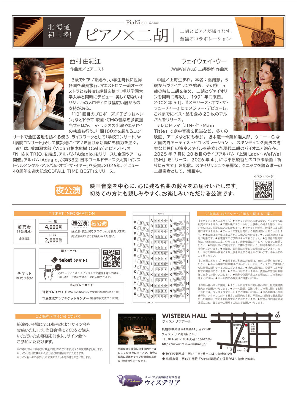 本シリーズ第3回となる今回は、初めて昼・夜2公演で開催いたします。昼公演ではクラシックの名曲を中心に、深みのある響きとともに親しみやすいプログラムを、夜公演では映画音楽を中心に、心に残る名曲の数々をお楽しみいただけます。いずれも二胡奏者ウェイウェイ・ウーを迎え、ピアノと二胡が織りなす新たな音楽の魅力をご体感いただけます。舞台と客席の距離が近いウィステリアホールならではの空間で、音の細やかなニュアンスまで味わえる特別なひととき。昼と夜、それぞれ異なる表情を持つ音楽の世界を、ぜひ聴き比べてみてください。