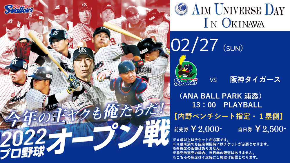 AIM UNIVERSE DAY IN OKINAWA 2022プロ野球オープン戦(2/27・東京ヤクルトスワローズ 対 阪神タイガース・浦添開催)試合観戦チケット販売ページ【内野ベンチシート指定・1塁側】です。