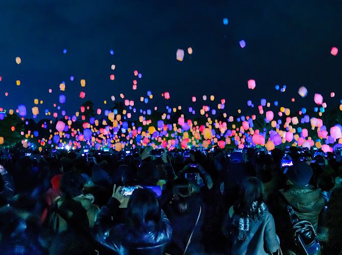 「天空さくらフェスティバル」では、ランタンを桜に見立てて、夜空へリリースします。