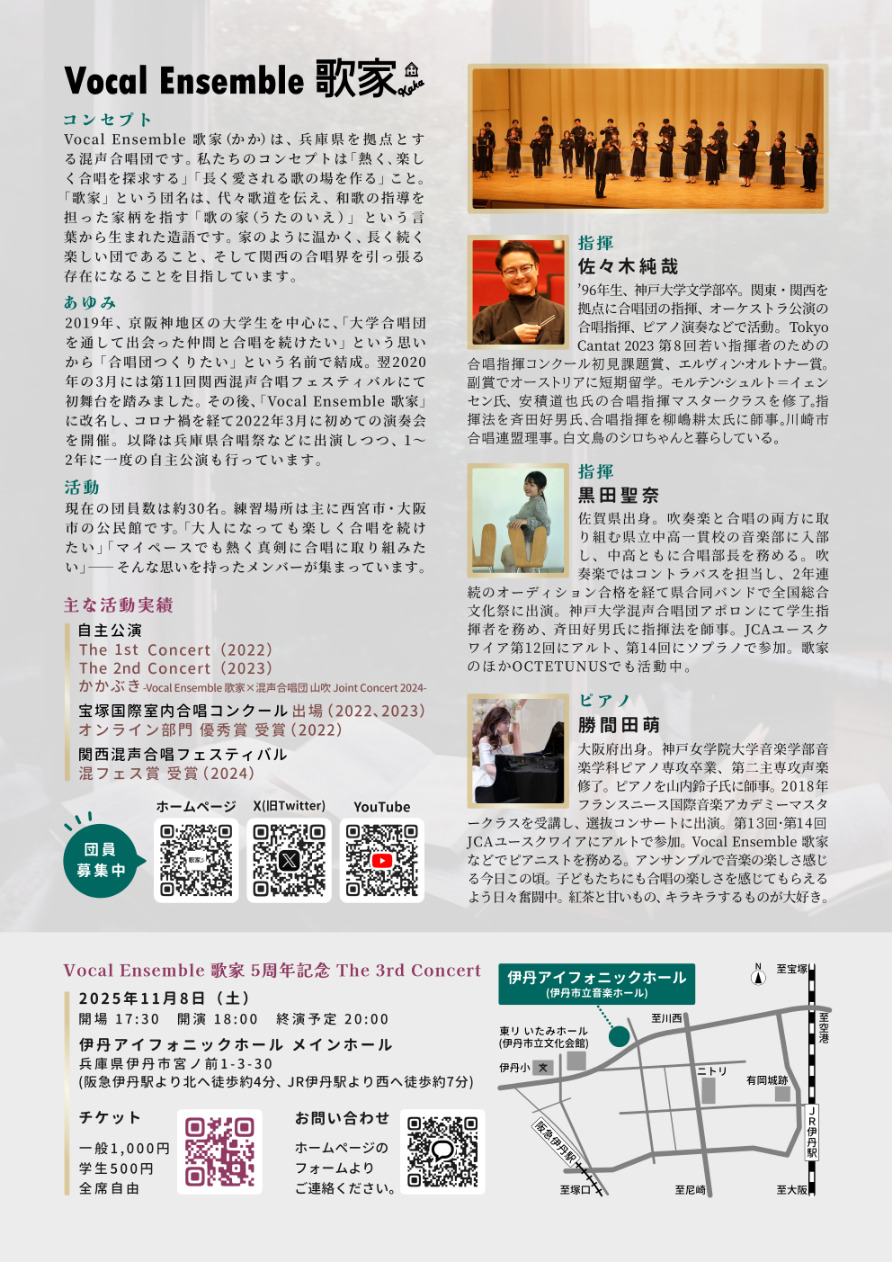 Vocal Ensemble 歌家(かか)は、兵庫県を拠点とする混声合唱団です。私たちのコンセプトは「熱く、楽しく合唱を探求する」「長く愛される歌の場を作る」こと。